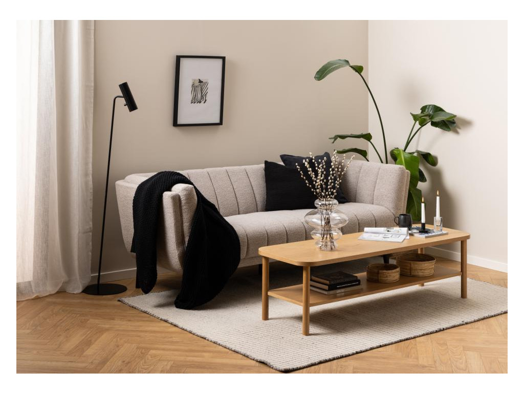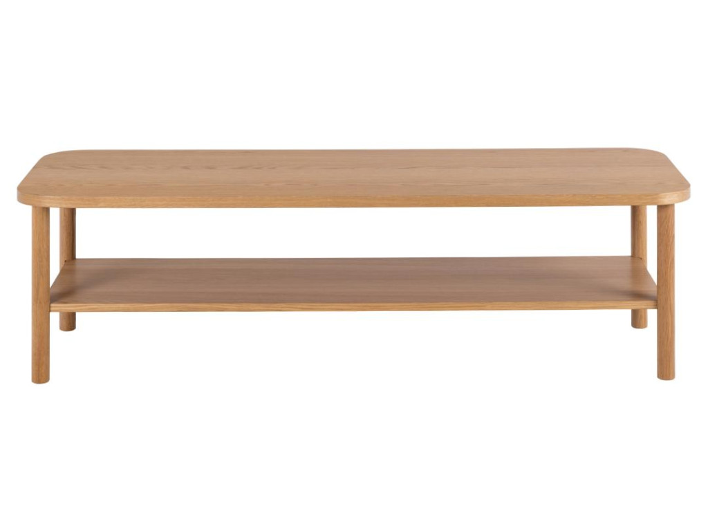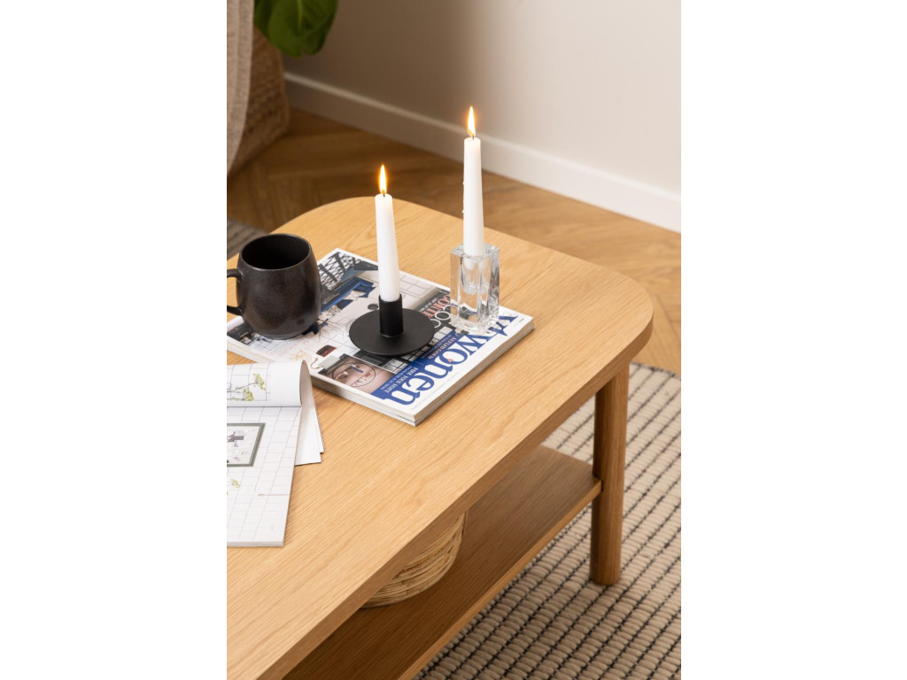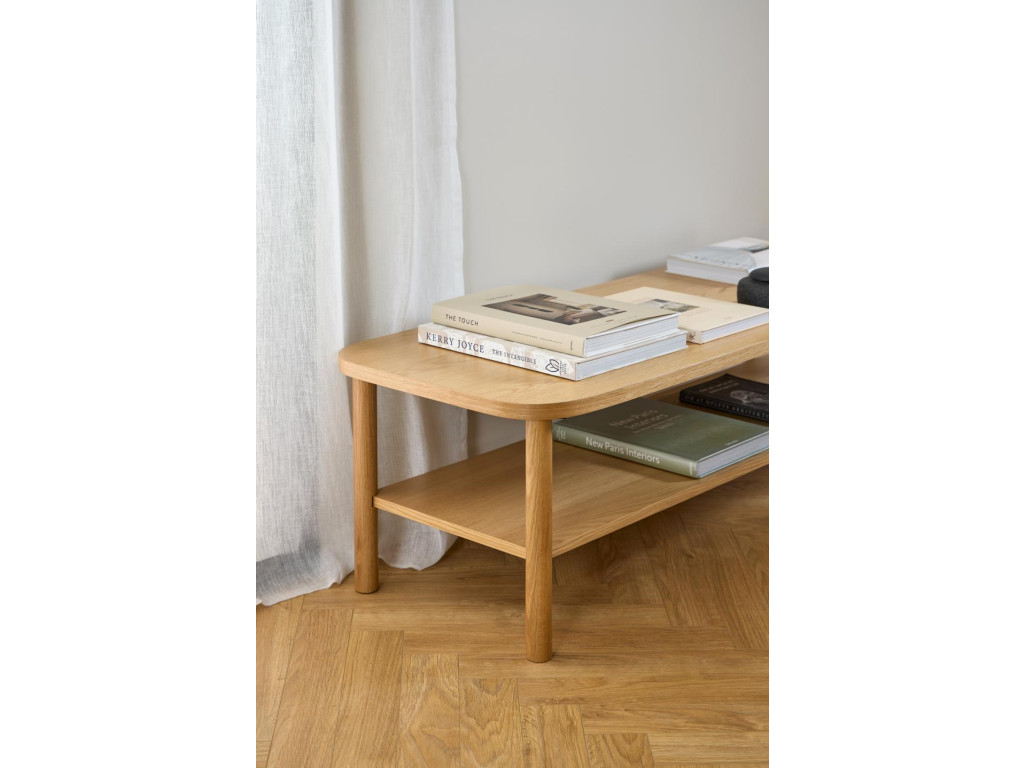 Pod vrchnou doskou sa nachádza praktická polička, ideálna na odkladanie časopisov, ovládačov alebo iných každodenných drobností. Stolík stojí na štvorici okrúhlych nôh z masívneho dubu s NC lakovaním, ktoré dotvárajú prirodzený a čistý výraz nábytku.