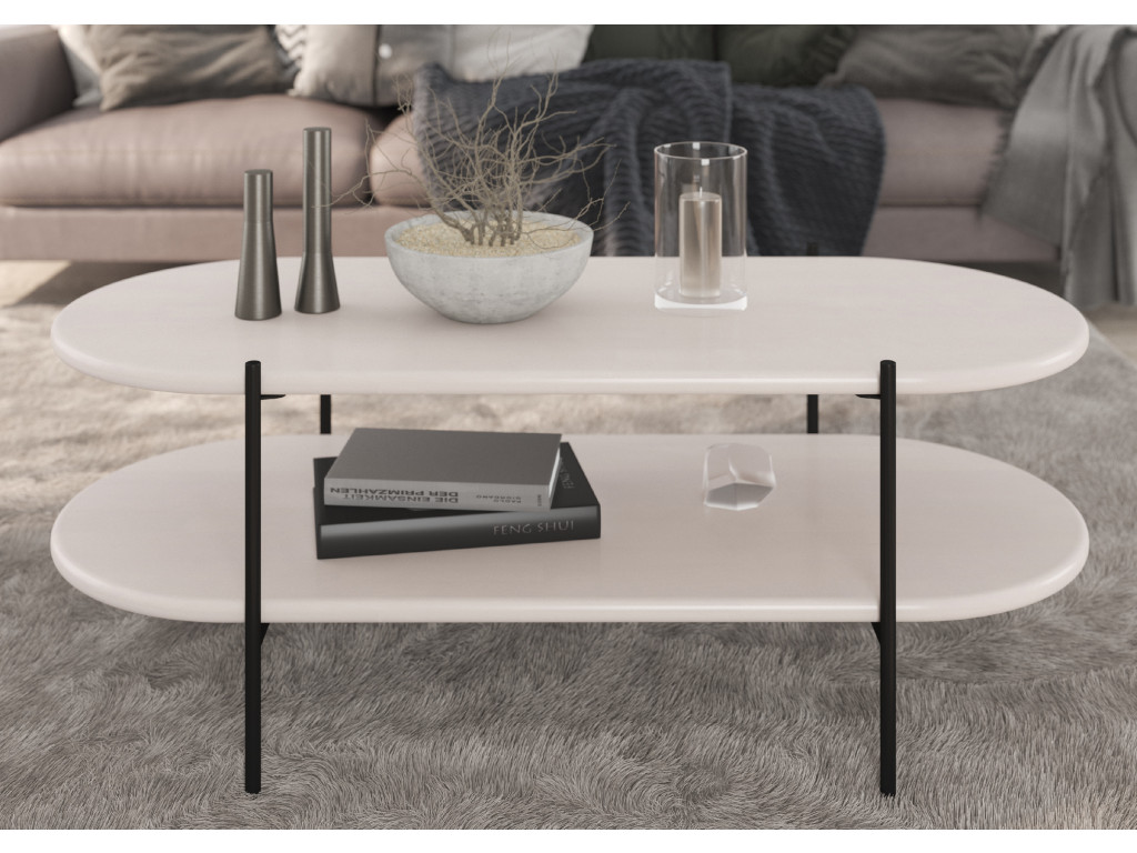 Konferenčný stolík z masívu v bielej farbe rozjasní každý interiér a poskytne úložný priestor pre občerstvenie, knihy, dekorácie a ďalšie. Oválny konferenčný stôl je vynikajúcim doplnkom do moderných aj klasických interiérov. Stojí na vysokých čiernych nožičkách, vďaka ktorým môžete neustále pod stolom udržiavať poriadok.