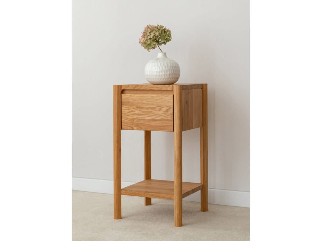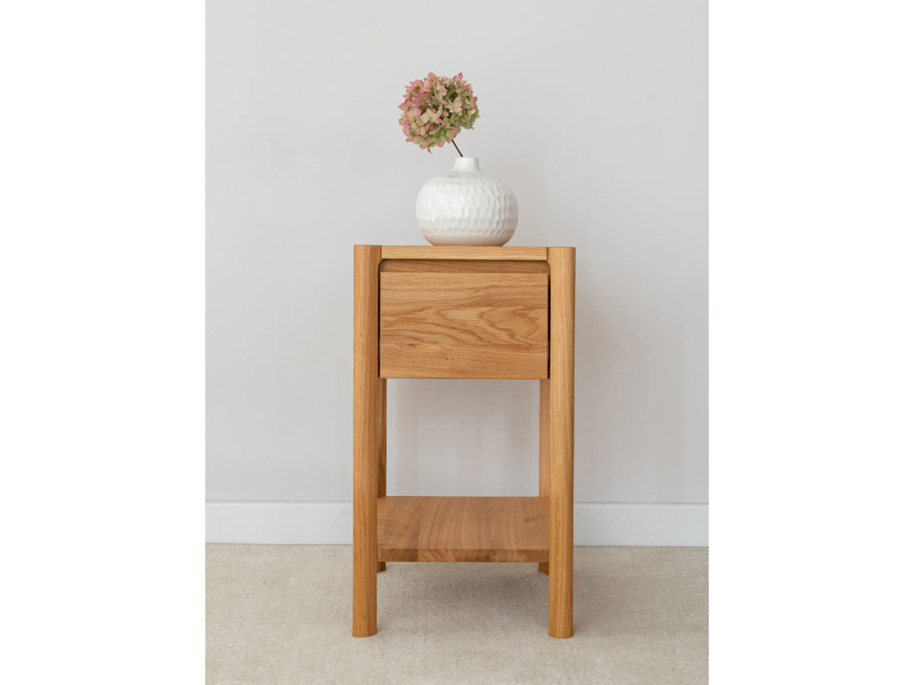 Nízky odkladací stolík z kolekcie Campi z masívneho dubového dreva spája minimalistický dizajn s praktickým využitím v kompaktnom formáte. Je vybavený zásuvkou s tlmeným dovieraním Hettich a otvorenou policou, ktoré poskytujú dostatok úložného priestoru na každodenné drobnosti. Povrchová úprava olejovaním v polomatnom prevedení zvýrazňuje prirodzenú kresbu dreva a zároveň ho chráni. Vďaka svojim rozmerom je ideálny ako nočný stolík, príručný stolík alebo doplnok do predsiene. Rozmery: 33 × 60 × 33 cm (š × v × h).