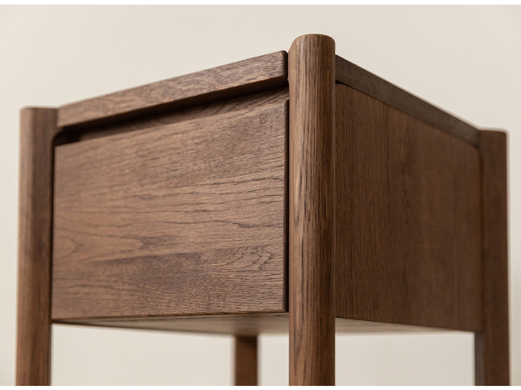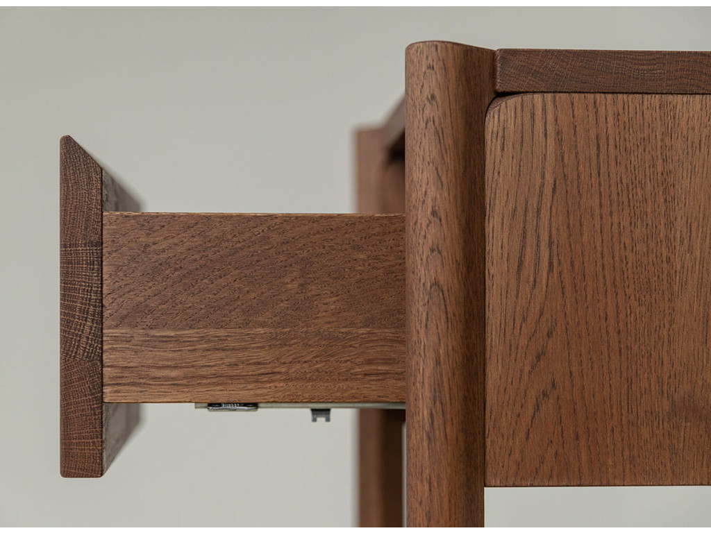 Celá séria je vyrobená z kvalitného dubového masívu, ktorý vyniká dlhou životnosťou. Konečná úprava olejovaním v polomatnom prevedení zvýrazňuje prirodzenú kresbu dreva, chráni povrch a zachováva jeho autentický charakter. Kolekcia je dostupná v dvoch farebných variantoch – prírodný dub a tabakovo hnedá.