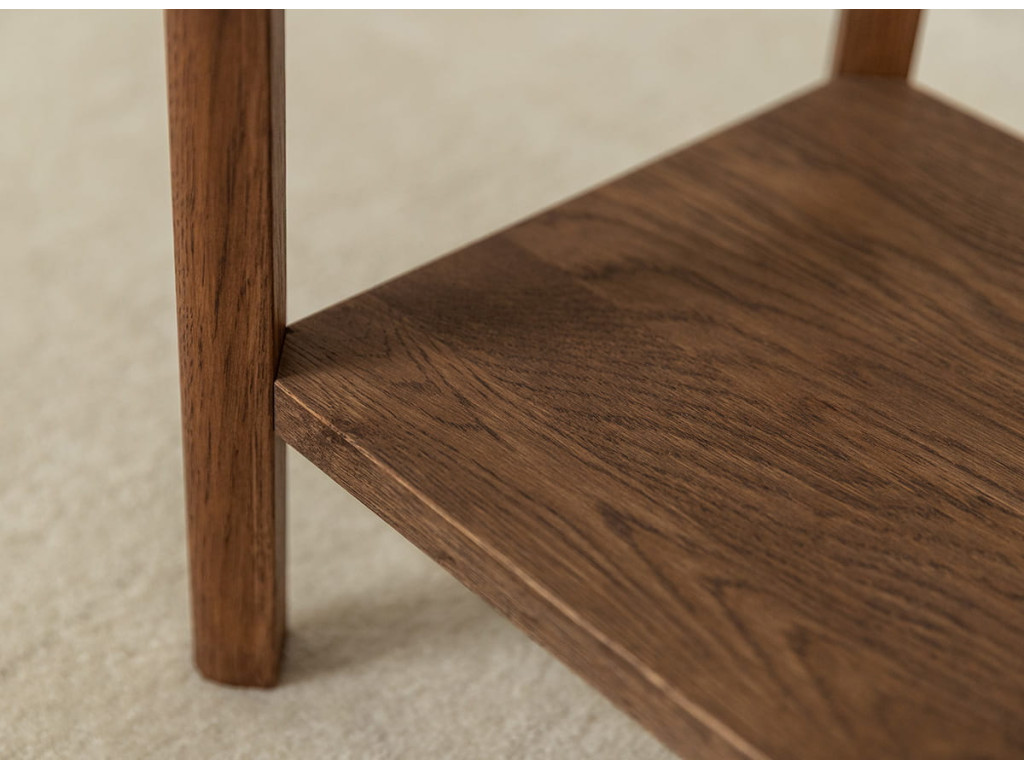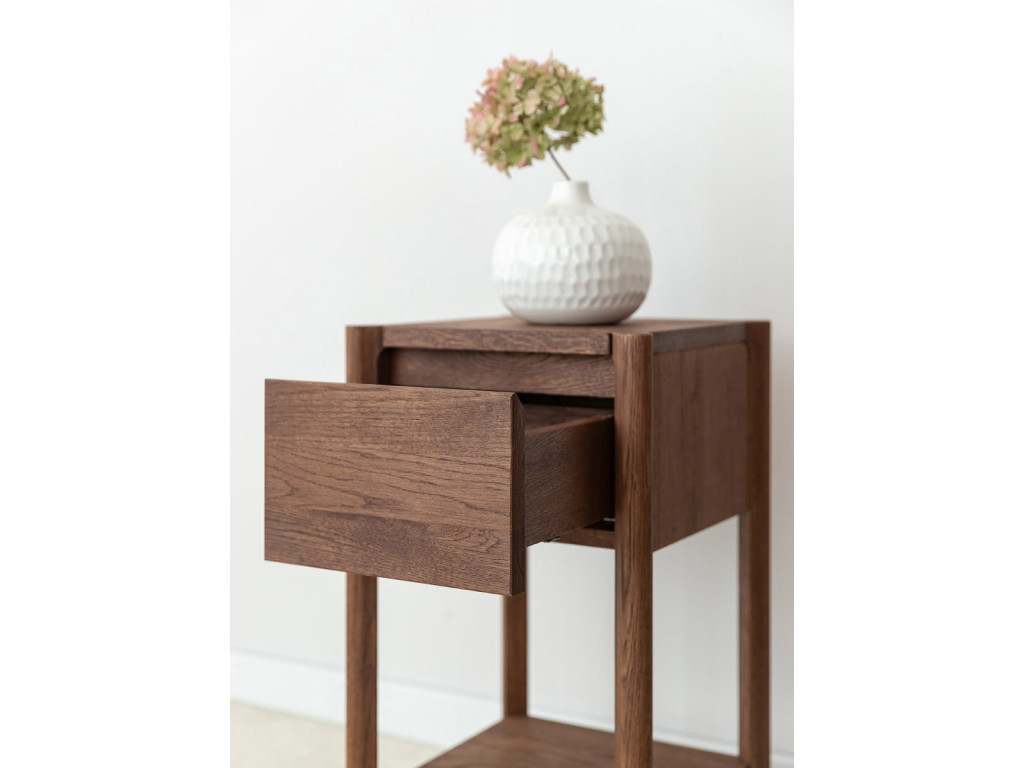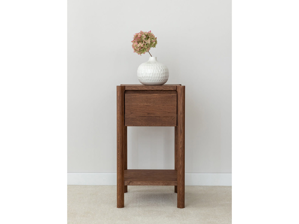 Odkladací stolík Campi v prevedení tabakovo hnedá ponúka elegantné riešenie úložného priestoru v malom formáte. Vyrobený z masívneho dubu s olejovanou povrchovou úpravou vyniká odolnosťou aj prirodzenou krásou dreva. Praktická kombinácia zásuvky s tichým dovieraním a otvorenej police zvyšuje jeho funkčnosť. Skvele sa hodí vedľa postele, pohovky alebo ako doplnok do menších priestorov. Rozmery: 33 × 60 × 33 cm (š × v × h).