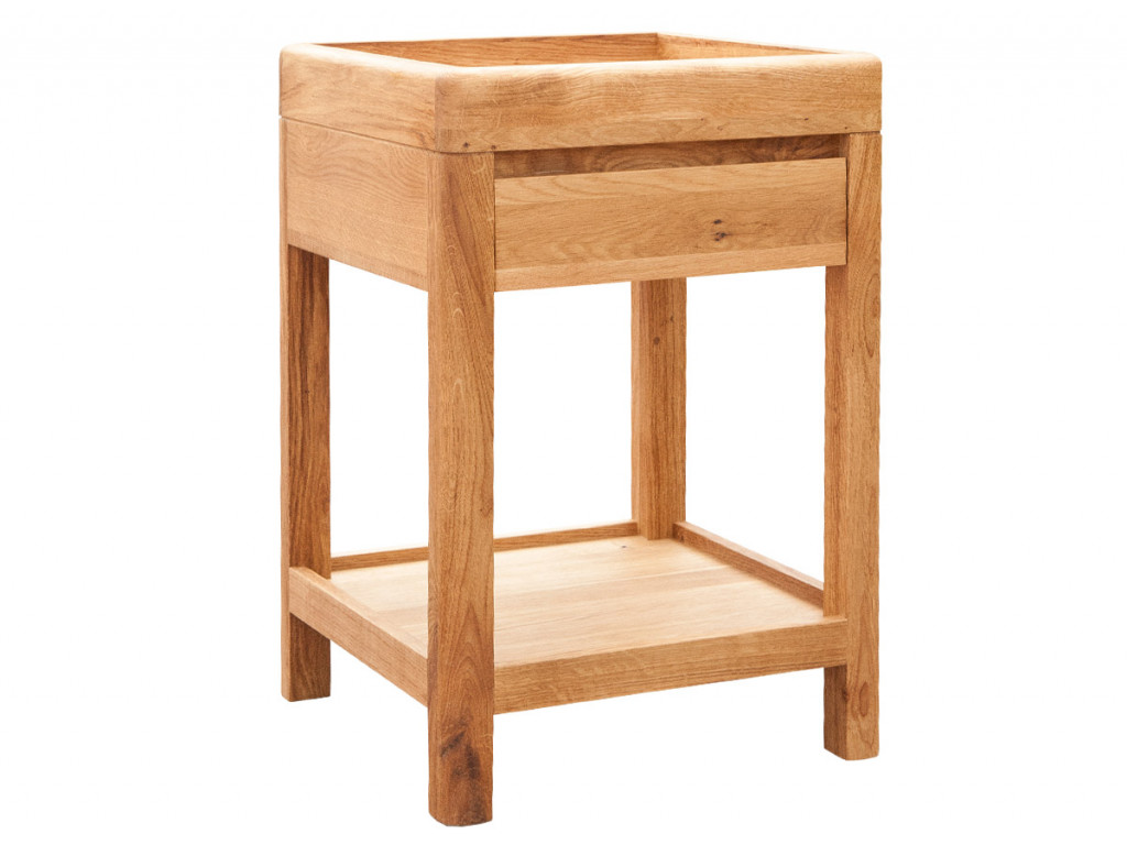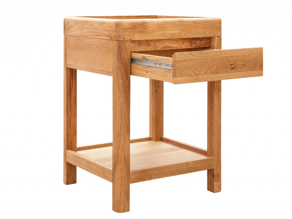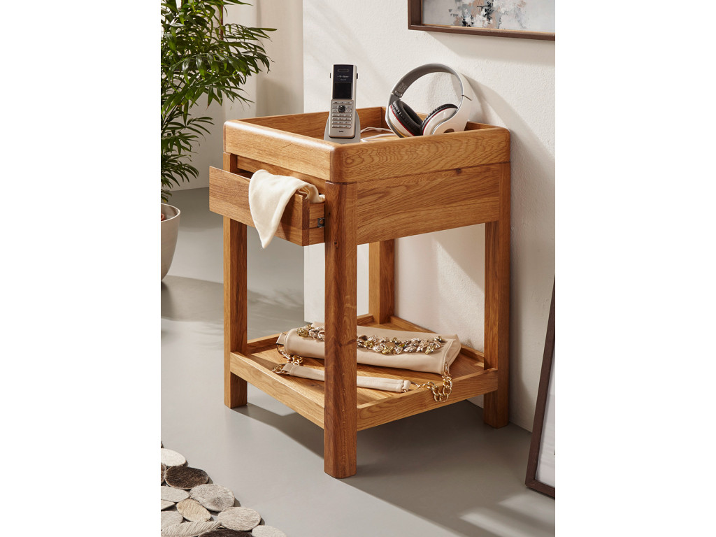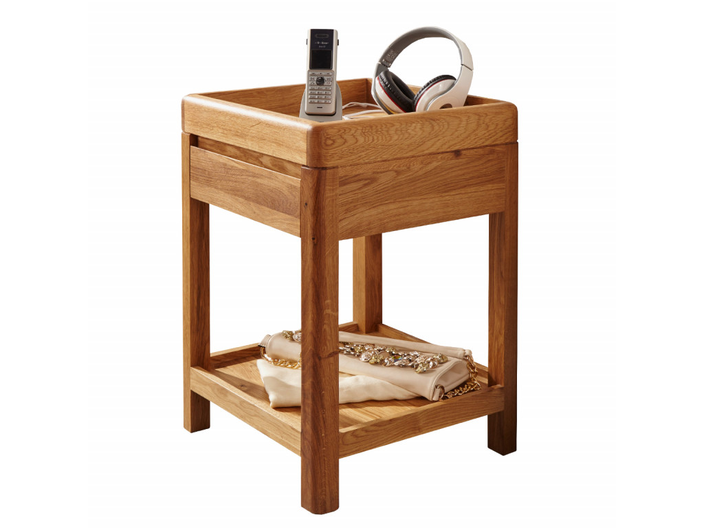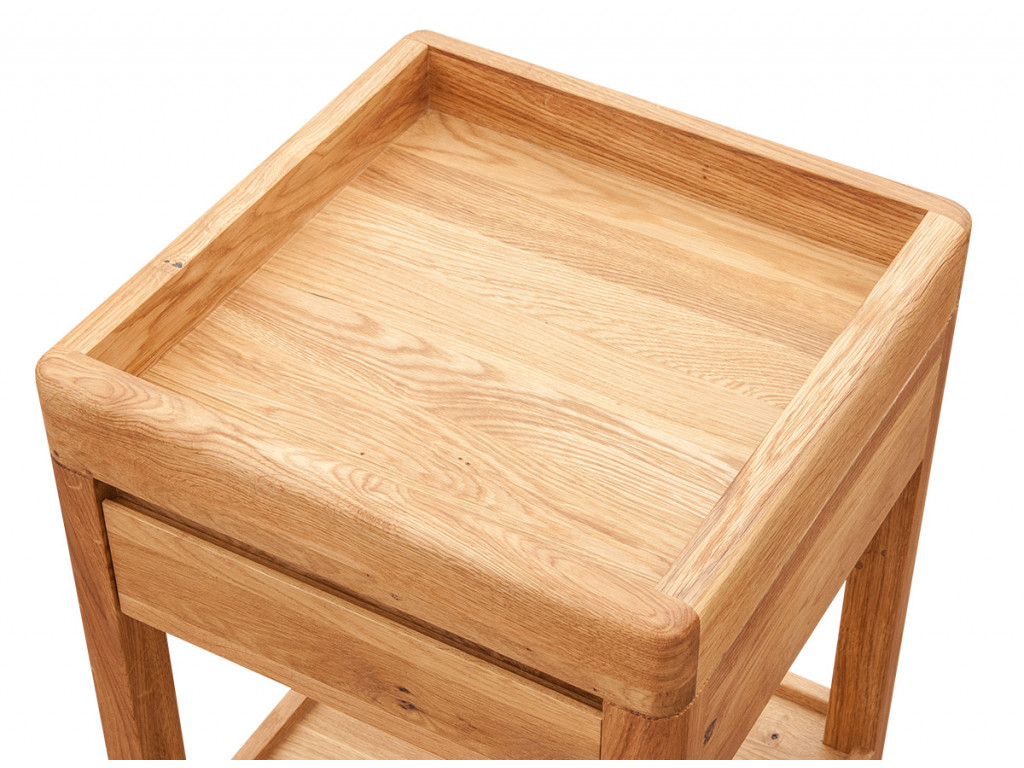 Štvorcový príručný stolík do obývačky alebo chodby je perfektným doplnkom na uskladnenie kníh, doplnkov, telefónu či dobrého vína. Je vyrobený z masívneho duba vo farbe dub. Stojí na vyšších nožičkách a disponuje 2 policami a zásuvkou. Stolík je praktický, ľahký, prispôsobivý a vyrobený s láskou k masívnemu drevu.