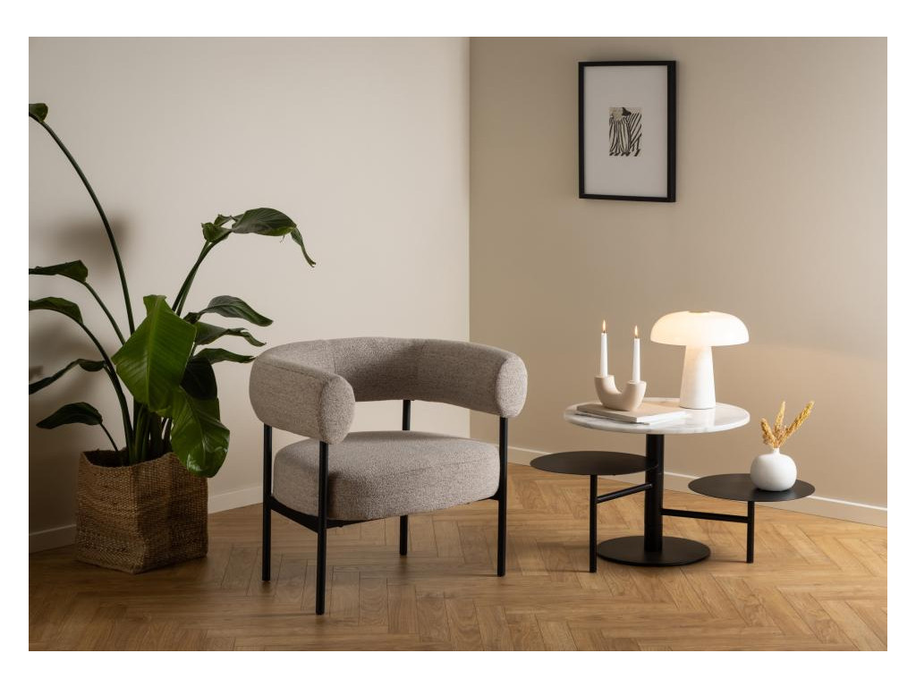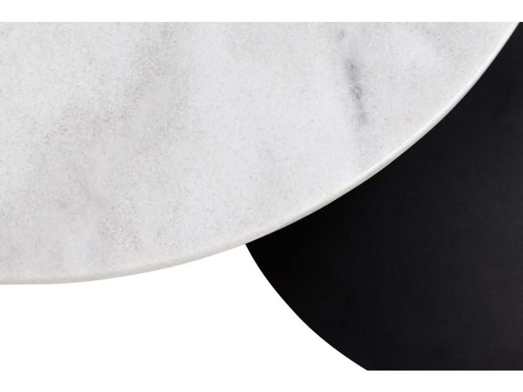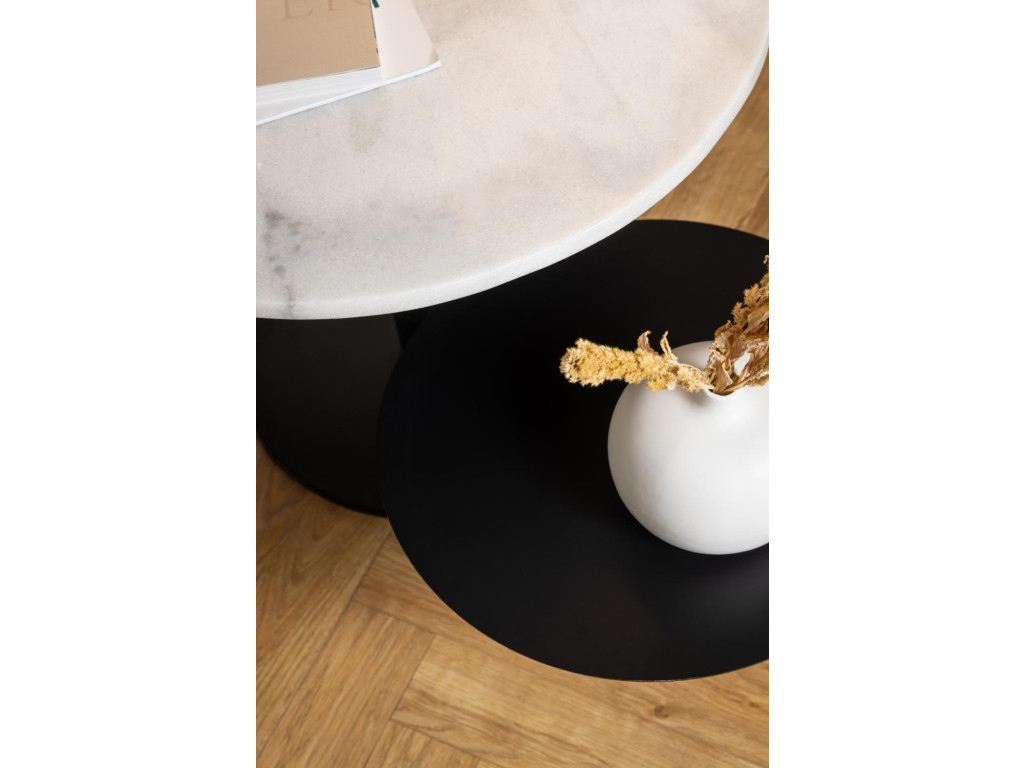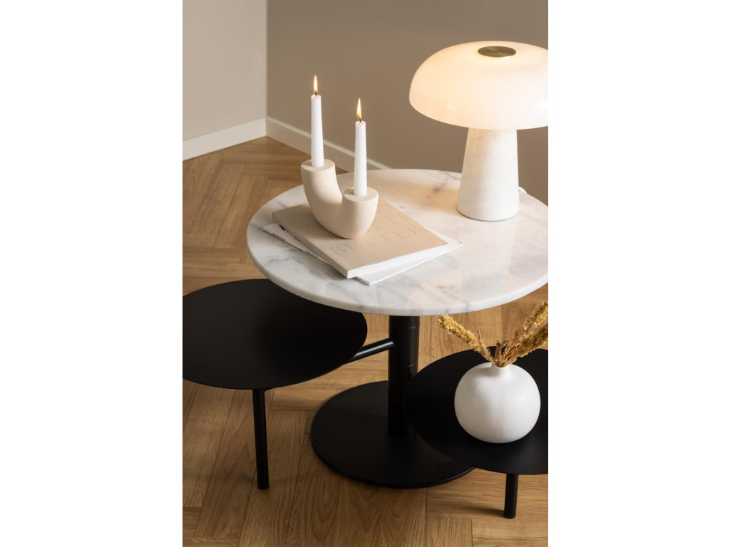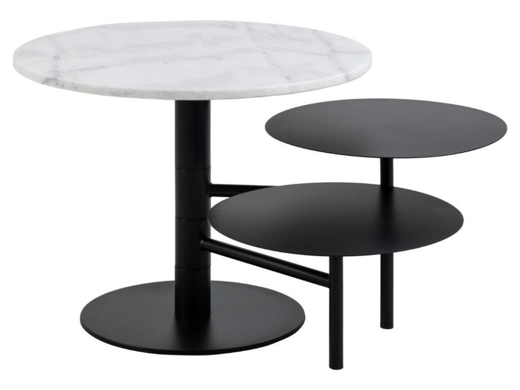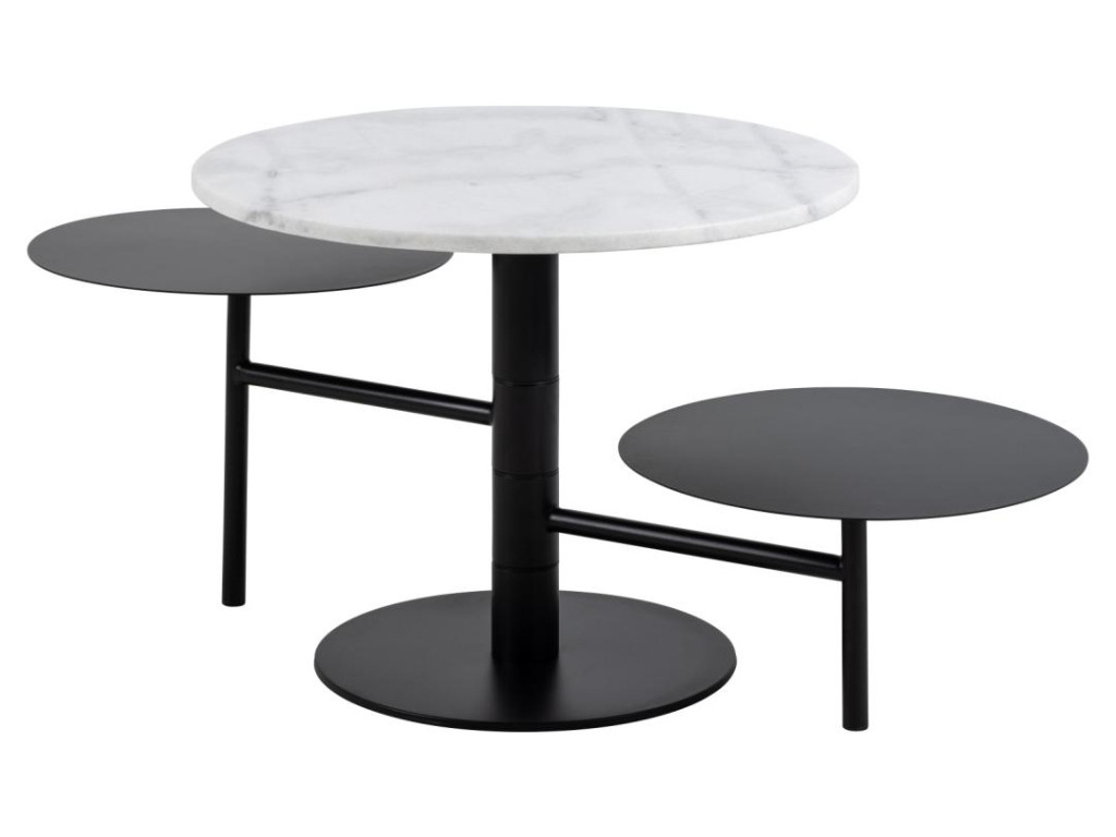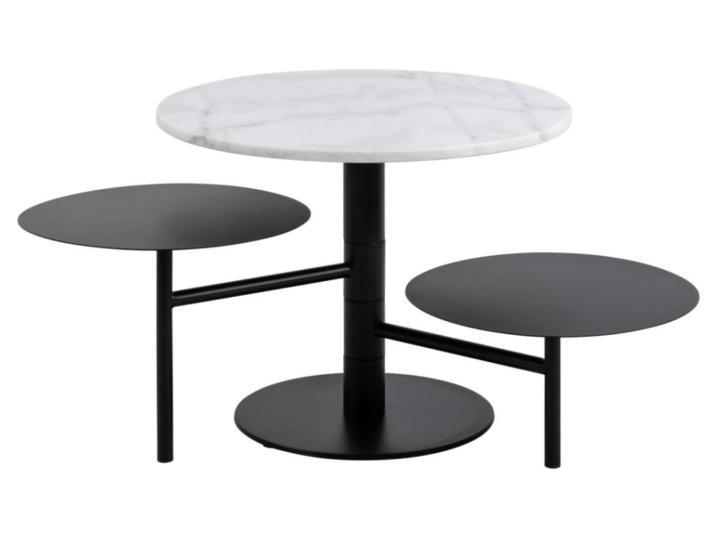 Okrúhla konferenčná súprava Lahti, Ø60x47 cm, je dizajnovaný s dôrazom na flexibilitu a funkčnosť. Tento trojúrovňový stôl má 2 otočné ramená, ktoré umožňujú individuálne usporiadanie výškových úrovní. V strede dominuje biela leštená mramorová doska Guangxi, ktorú dopĺňajú čierne oceľové platne s matným povrchom. Základňa z práškovo lakovanej ocele v matnej čiernej dodáva stolíku stabilitu a štýlový kontrast. Tento moderný prvok sa výborne hodí do sofistikovaných obývačiek.