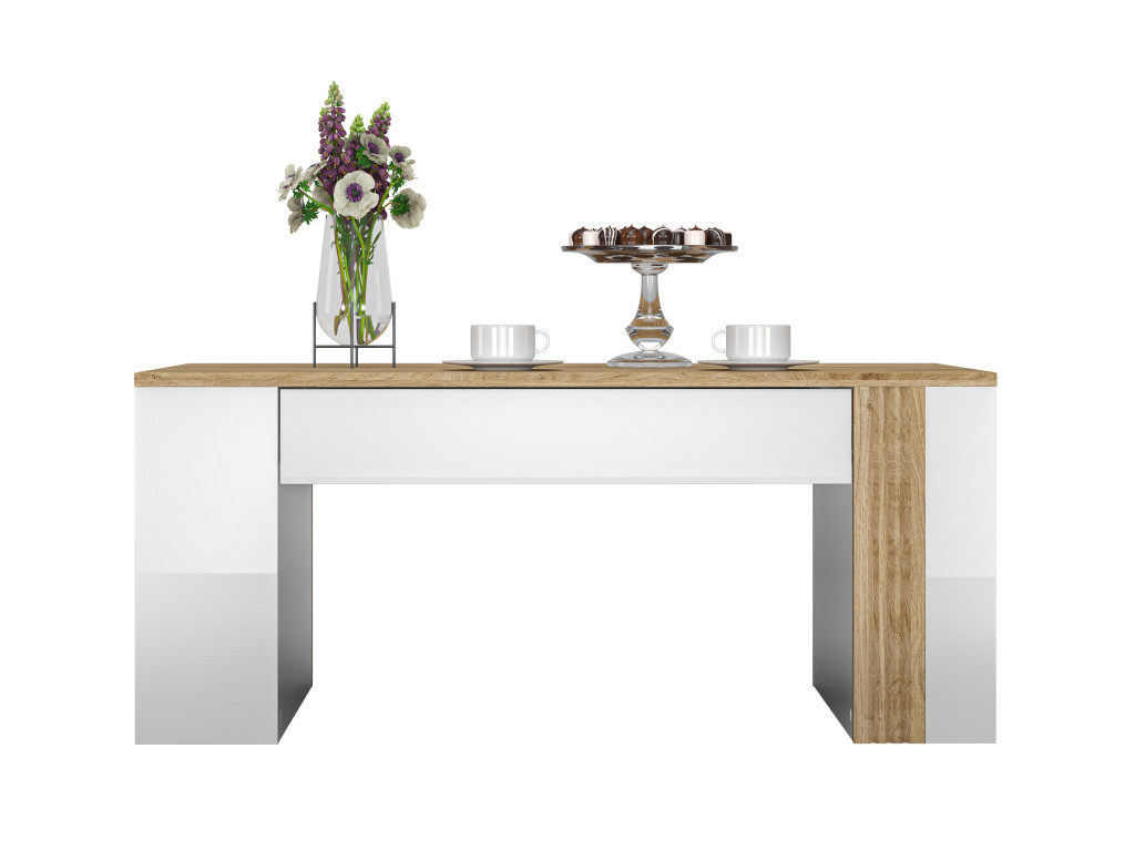 Konferenčný stolík Adagio 10 zaujme svojím elegantným dizajnom s obdĺžnikovou doskou o rozmeroch 109x60 cm. Má bočné poličky na nohách a stredovú zásuvku pod doskou, čo prináša praktický úložný priestor a štýl do vášho interiéru.