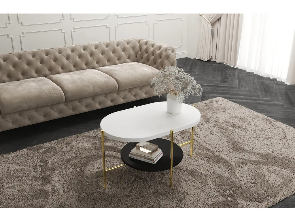 Moderný čierno-biely konferenčný stolík Arena, vnesie do interiéru eleganciu a jemnosť. Konferenčný stolík je vyrobený z laminovanej drevotriesky. Vrchná doska stolíka je v bielej farbe. Zlaté nohy a spodná doska v čiernej matnej farbe pridávajú stolíku na elegancii.