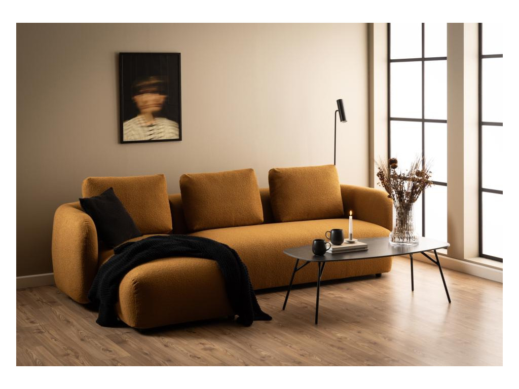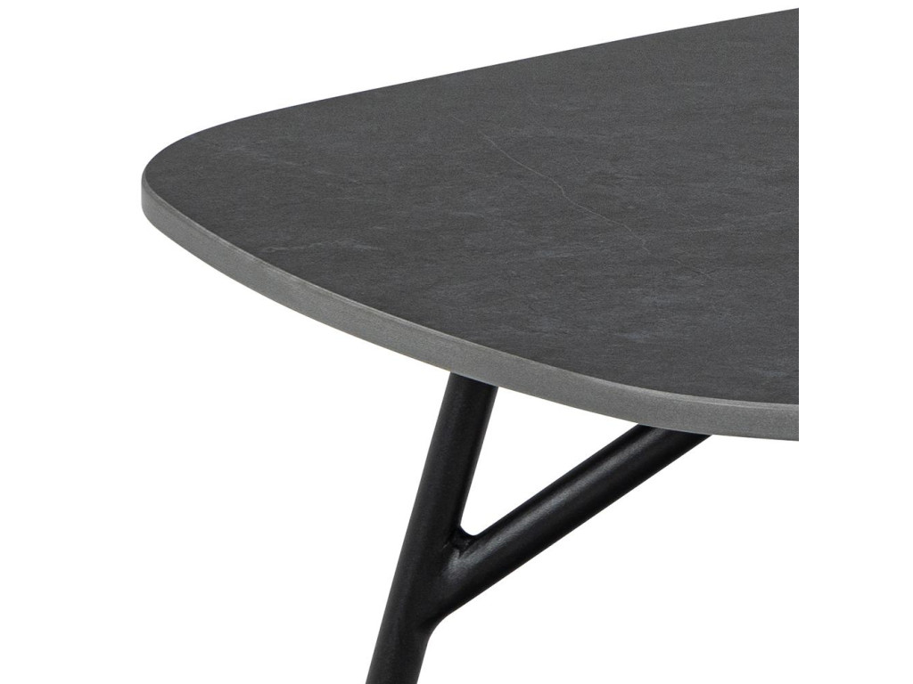 Stolík má rozmer 120 × 60 × 41 cm a stojí na štíhlych oceľových nohách s matnou čiernou práškovou povrchovou úpravou, ktoré zabezpečujú pevnosť a stabilitu. Vďaka kombinácii prírodne pôsobiacej keramickej dosky a industriálnych kovových prvkov pôsobí nábytok moderne, ale zároveň nadčasovo.