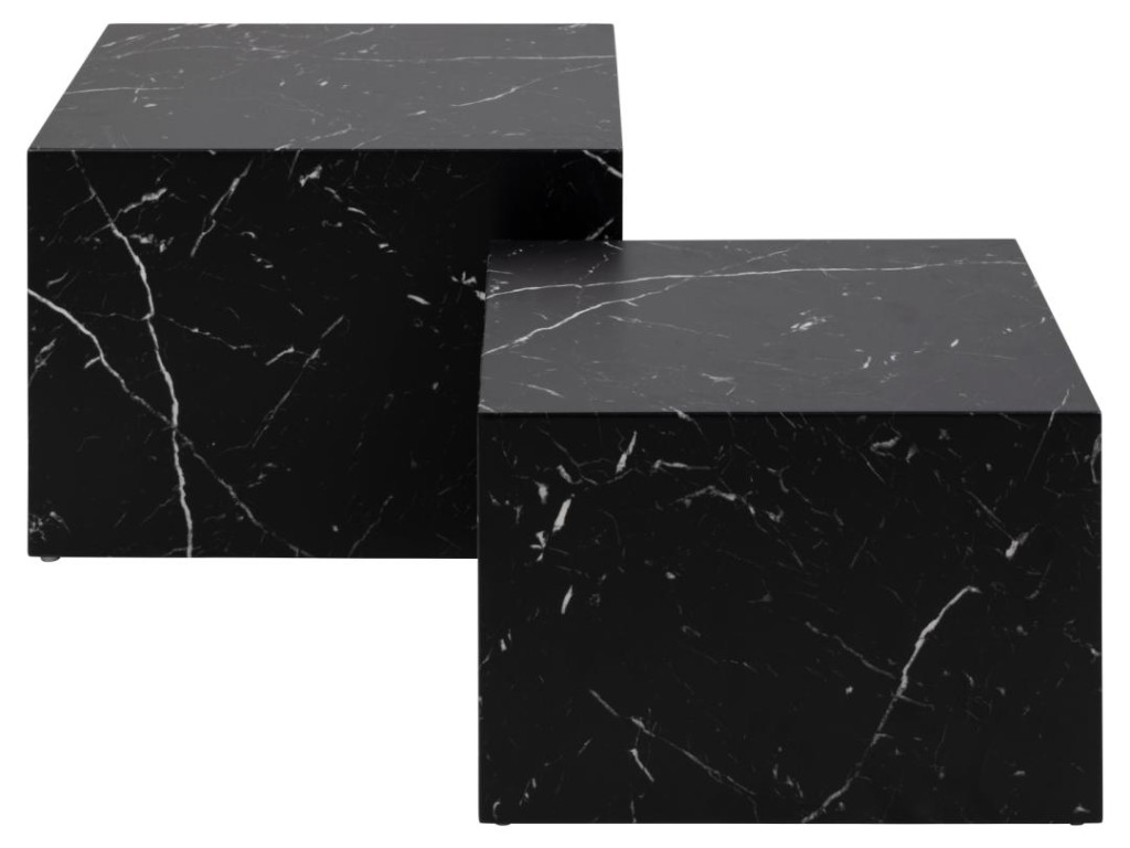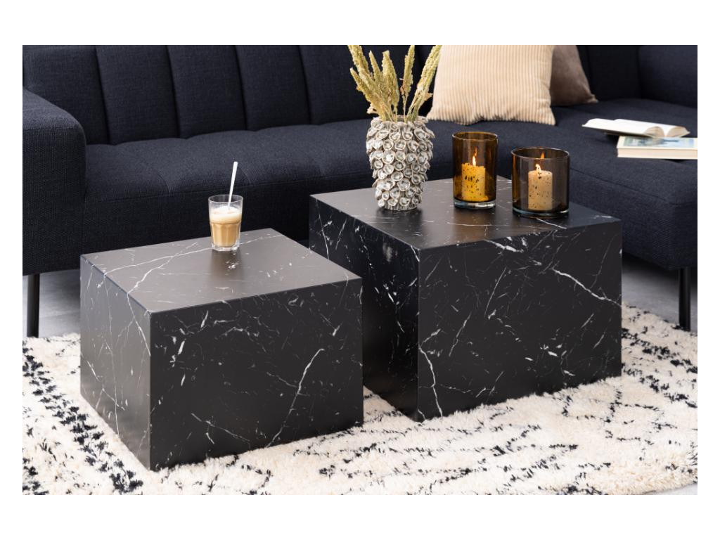 Sada konferenčných stolíkov Dice z čierneho mramoru Marquina v hranatom dizajne je moderným doplnkom každého interiéru. Elegantný štvorcový tvar a kvalitné materiály z MDF imitujú luxusný kameň. Sada obsahuje dva stolíky rôznych výšok pre praktické využitie. Skvelo sa hodia do obývačky alebo k sedacej súprave.