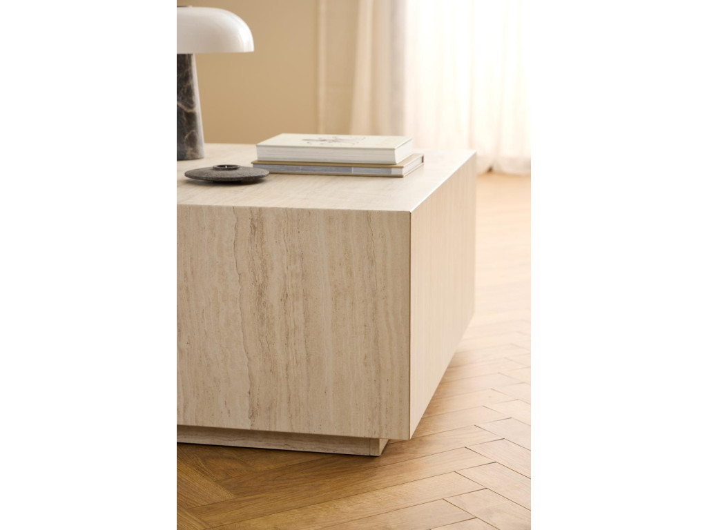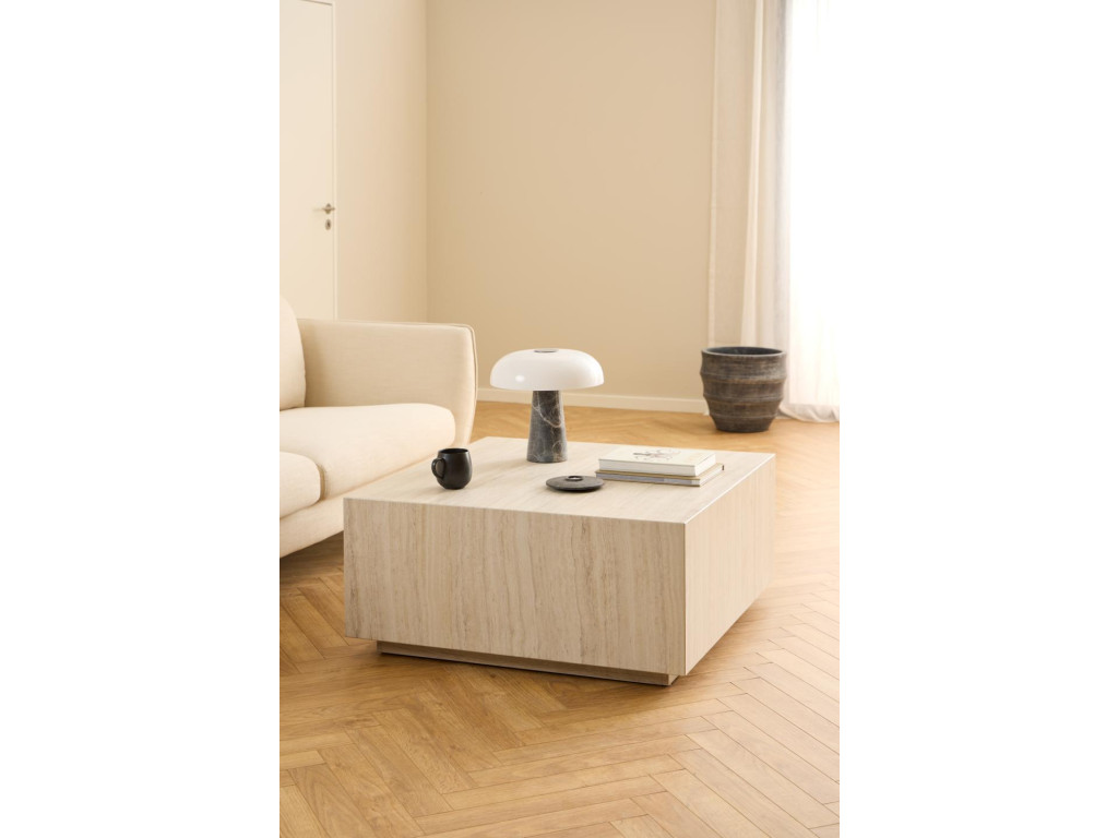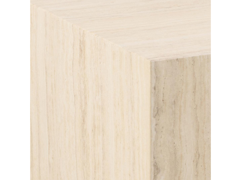 Konferenčný stolík Dice s hranatým tvarom pripomína kocku s luxusným nádychom. Béžový travertínový dekor pôsobí sofistikovane a štýlovo. Je skvelým centrálnym prvkom v obývačke. Vďaka robustnej konštrukcii je aj veľmi stabilný.