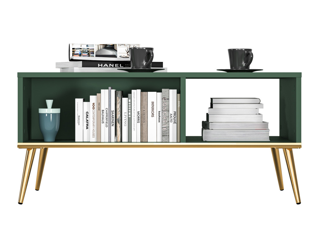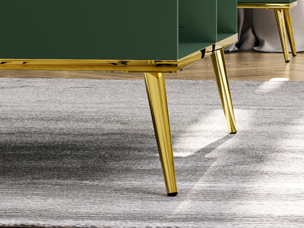 Konferenčný stolík Flora 07 v znamenitej zelenej farbe dodá vašej obývačke pôvab a jedinečný štýl. Zlaté nožičky stolíka spolu s elegantným povrchom vytvárajú atraktívny kontrast, ktorý oživí priestor. Vďaka priestrannej doske je tento stolík ideálny na vystavenie dekorácií alebo servírovanie, čím kombinuje krásu a jeho praktické vlastnosti v jednom.