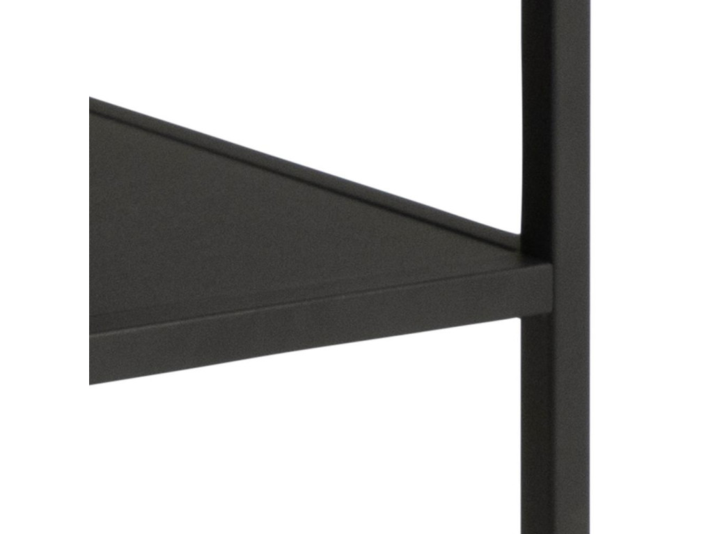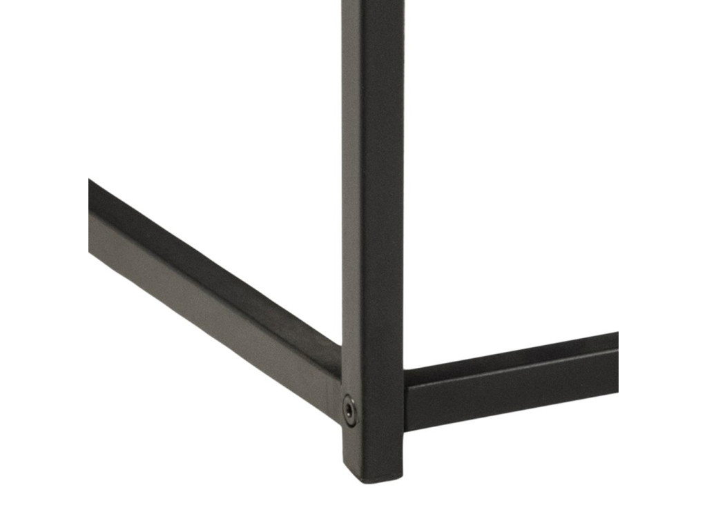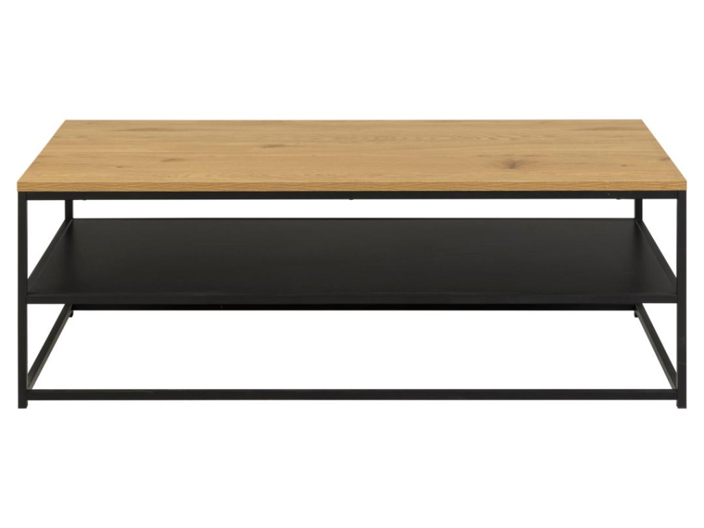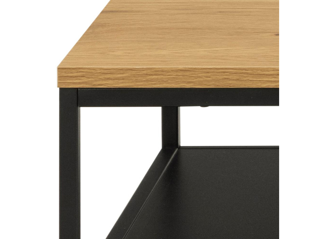 Čierna kovová základňa s matnou práškovou úpravou zaisťuje nielen stabilitu, ale zároveň pridáva stolíku výrazný kontrastný prvok. Otvorená čierna melamínová polica pod doskou ponúka praktický odkladací priestor na časopisy, ovládače alebo ďalšie každodenné drobnosti.