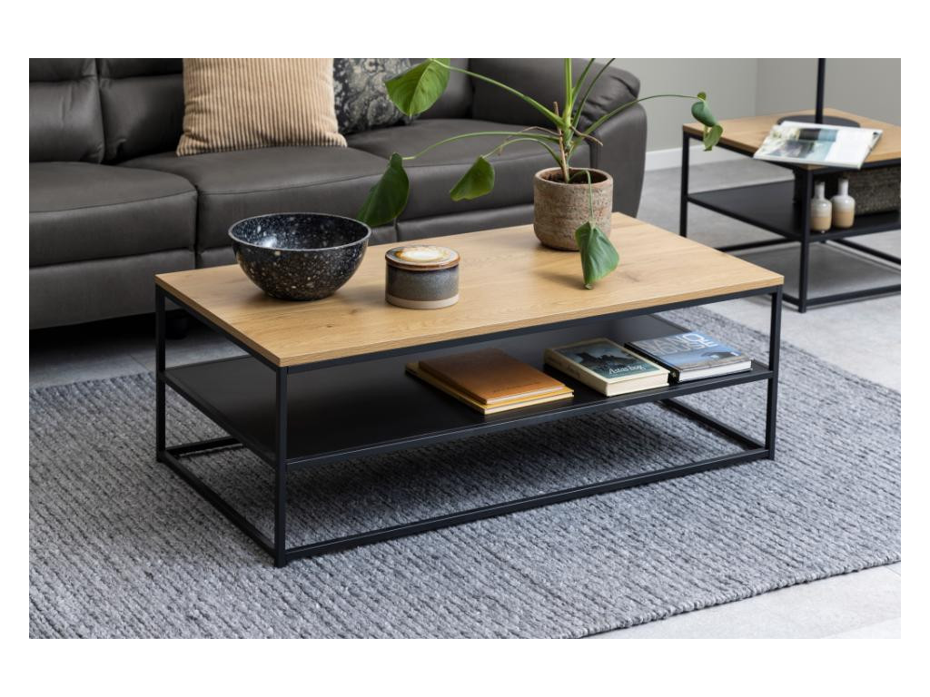 Stolík Gilas ponúka dlhú obdĺžnikovú dosku vhodnú na servírovanie či vystavenie dekorácií. Povrch z dubového dekoru v kombinácii s čiernou oceľovou základňou pôsobí vyvážene. Skvelo zapadne do obývačky zariadenej v modernom alebo industriálnom štýle. Odolné materiály zaručujú stabilitu.