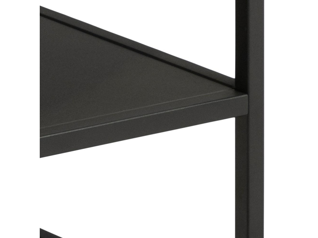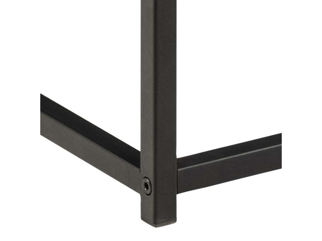 Kovová základňa s matnou čiernou práškovou úpravou dodáva stolíku vizuálnu pevnosť a zároveň zabezpečuje spoľahlivú stabilitu. Pod hlavnou doskou sa nachádza praktická otvorená polica z čierneho melamínu, vhodná na uloženie časopisov, diaľkového ovládača či iných drobností.