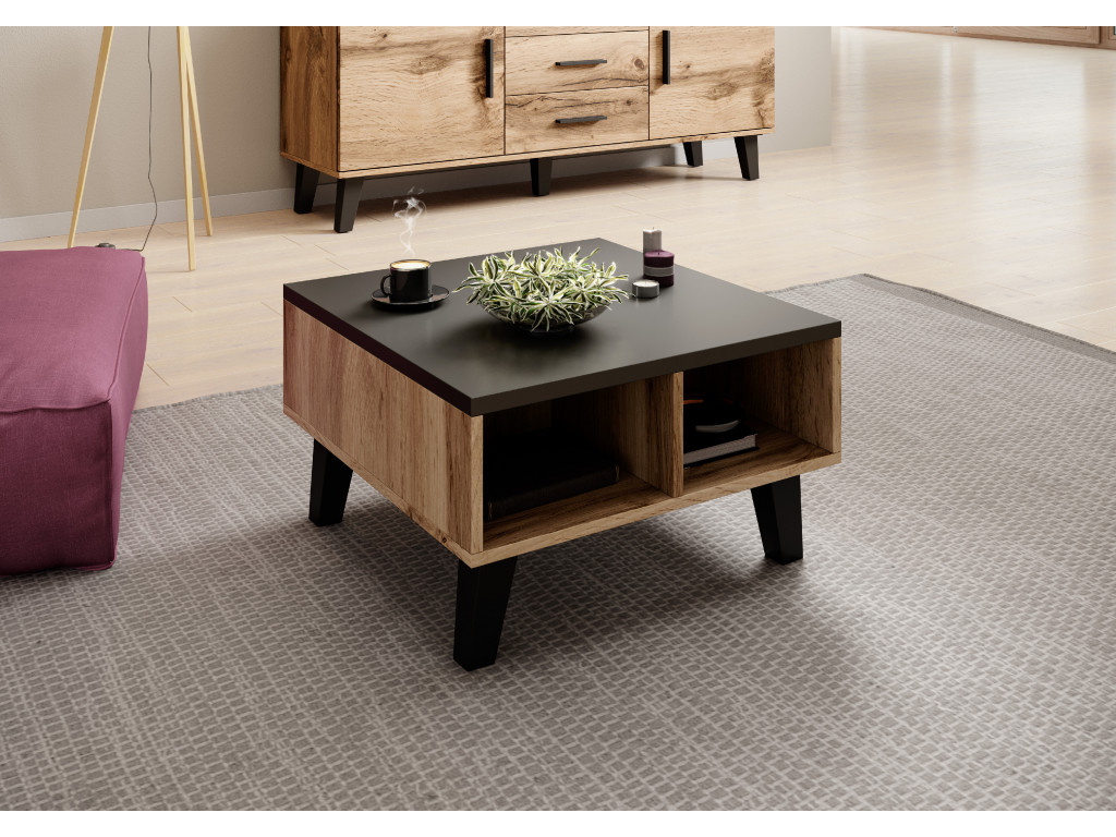 Teplý odtieň dubového dreva s čiernou matnou farbou vnesie do interiéru moderný a jedinečný dizajn. Konferenčný stolík Lotus je výnimočný najmä pre čierne nohy, na ktorých stolík stojí. Vrchná doska je v čiernej a poskytne priestor pre uloženie šálky čaju alebo občerstvenia. Vnútri stolíka sa nachádzajú police na odloženie osobných vecí, ovládača či knihy.