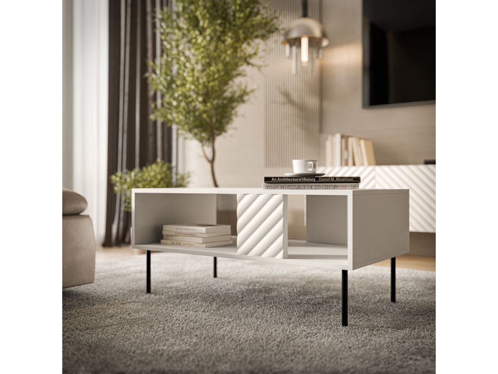 Biely konferenčný stolík Lucia pôsobí čisto a ľahko, ideálne doplní svetlé a minimalistické obývačky. Otvorená časť pod doskou ponúka praktický priestor na knihy či drobnosti. Diagonálne čelá krásne vyniknú aj v bielej úprave. Vizuálne stolík pôsobí subtílne, no poskytne viac, než sa na prvý pohľad zdá.