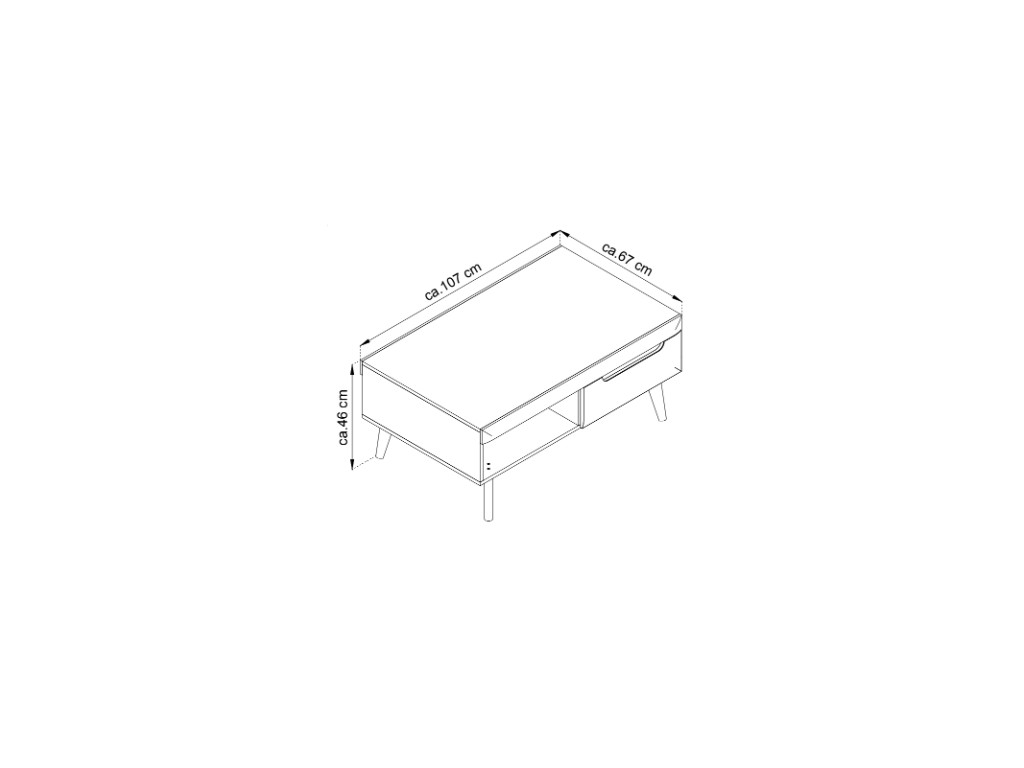 Konferenčný stolík na nožičkách Nordi je vyrobený z laminátových dosiek s ABS hranami, ktoré ho chránia pred poškodením. Dvierka sú vyrobené z MDF dosiek. Jeho súčasťou sú 2 malé zásuvky a otvorená polica pod vrchnou doskou. Charakteristickým prvkom sú 20 cm drevené nožičky.