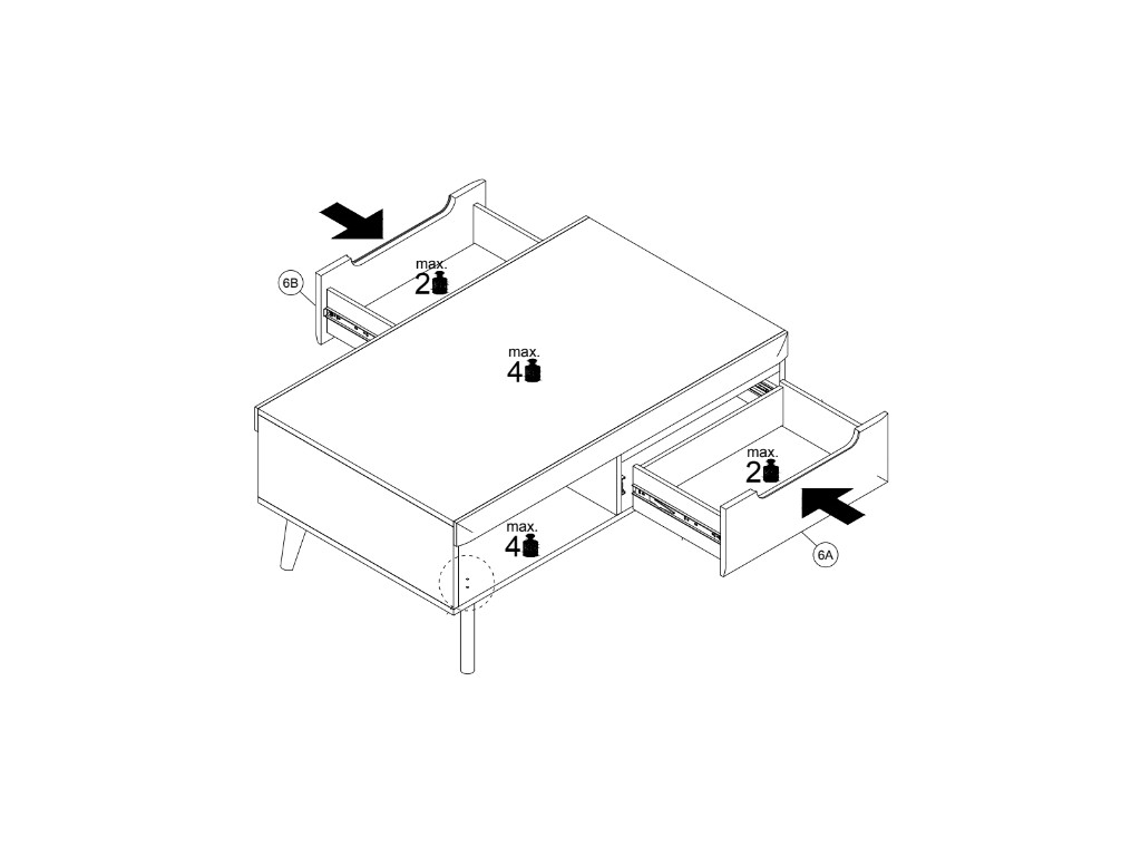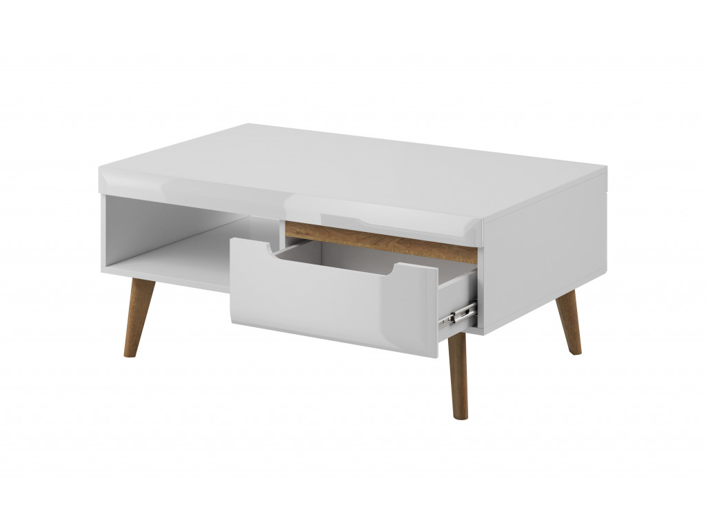 Konferenčný stolík Nordi v sebe spája moderný dizajn s krásnymi dekoračnými prvkami. Stojí na drevených nožičkách a na uskladnenie vecí ponúka 2 zásuvky a 1 otvorenú policu.