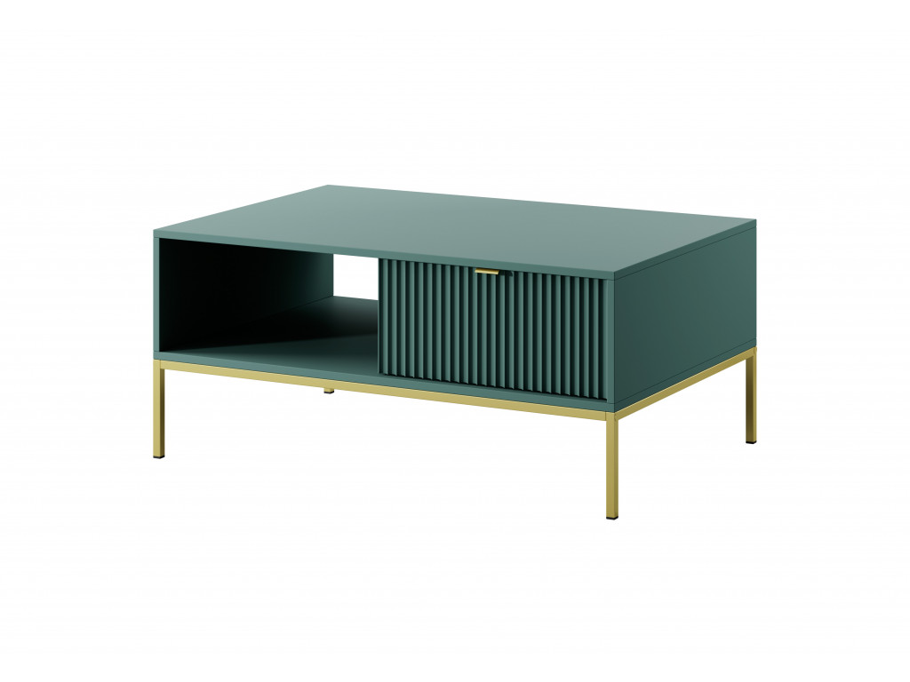 Zvýrazníte vašu obývačku novým konferenčným stolíkom so zásuvkou Novas. Stolík vyniká moderným dizajnom, ktorý vo vašom interiéri zažiari. Predné drážkované časti sú doplnené o úchytky v zlatej farbe z hliníka. Stolík do obývačky stojí na zlatej konštrukcii, ktorá mu dodáva ľahkosť.