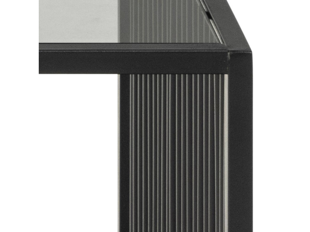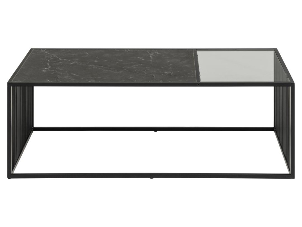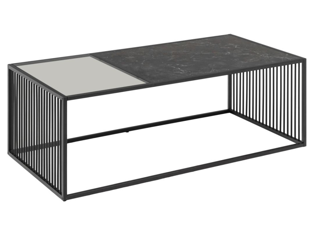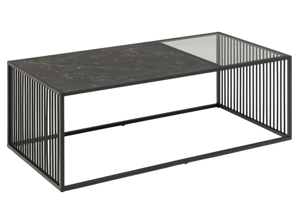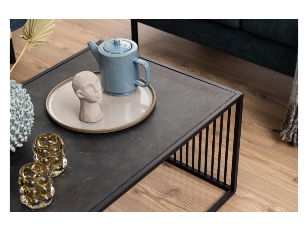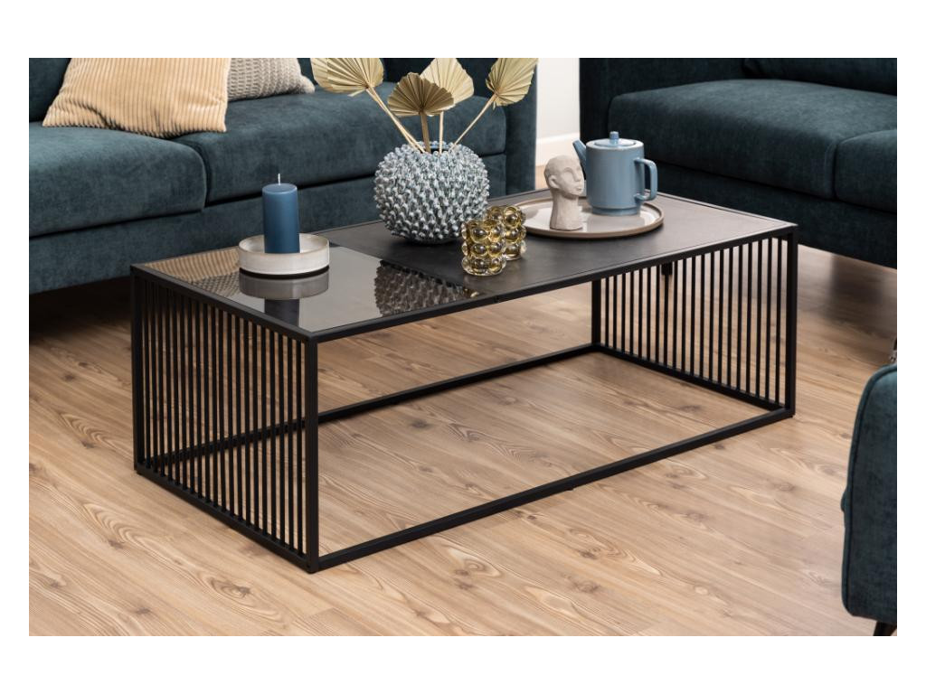 Obdĺžnikový stolík Strington je ideálny do priestrannejších obývacích izieb. Kombinuje čierny melamín s dymovým sklom a drôteným rámom pre výrazný dizajnový efekt. Ponúka dostatok miesta pre občerstvenie či dekorácie. Vynikne najmä v moderných a loftových interiéroch.
