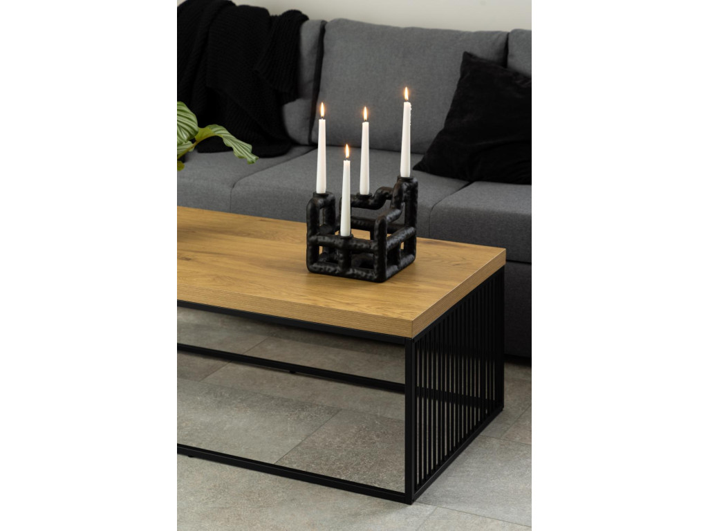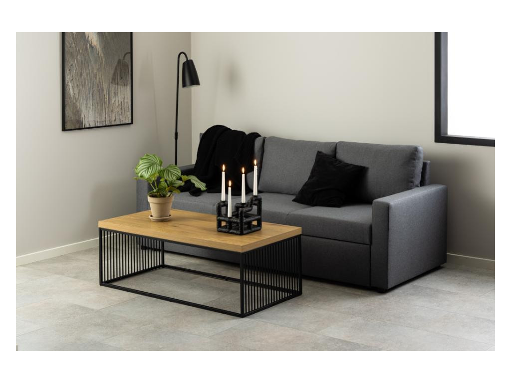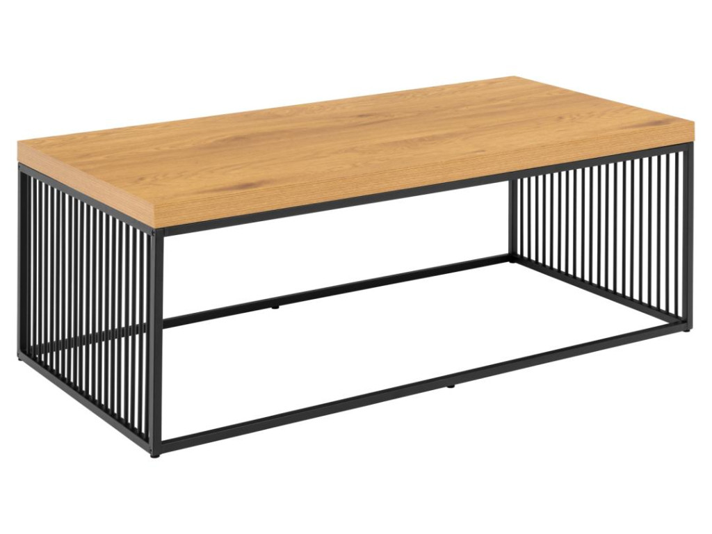 Stolík Strington ponúka ideálne spojenie prírodného dizajnu a modernej konštrukcie. Vrchná doska z matného divokého duba dodáva teplo domovu, zatiaľ čo čierna drôtená podnož z ocele dodáva industriálny nádych. Vďaka svojim rozmerom je ideálny do obývačky ako centrálny stolík. Odolnosť a štýl v jednom kúsku.