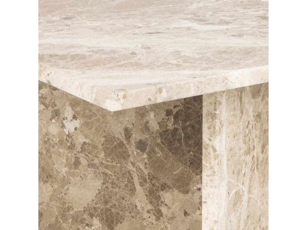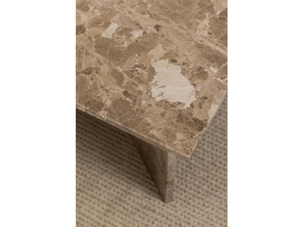 Vyrobený z prírodného tureckého mramoru, každý kus má originálnu kresbu, štruktúru a farebný odtieň, vďaka čomu je úplne jedinečný. Matný lakovaný povrch zvýrazňuje hĺbku materiálu a dodáva stolíku jemný sofistikovaný lesk.