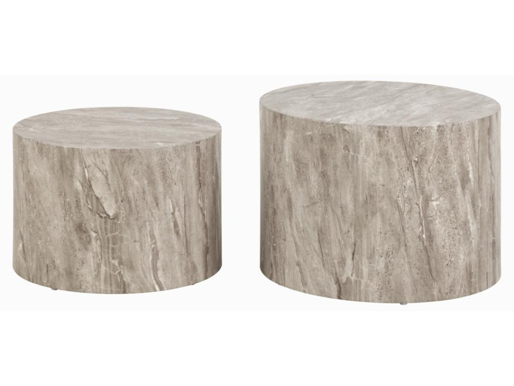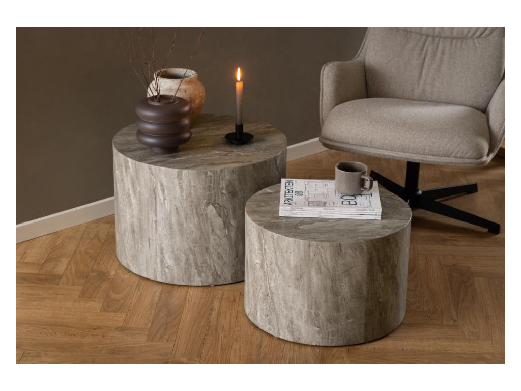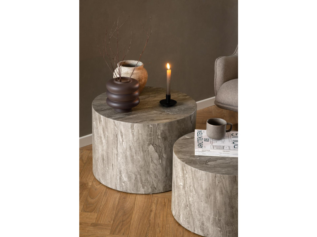Sada Dice v sivom mramorovom dekore ponúka štýlové riešenie odkladacích plôch v obývačke. Okrúhly dizajn je jemný, no výrazný. Využitie dvoch veľkostí umožňuje praktické usporiadanie. Moderný vzhľad ladí s interiérmi v neutrálnych a industriálnych tónoch.