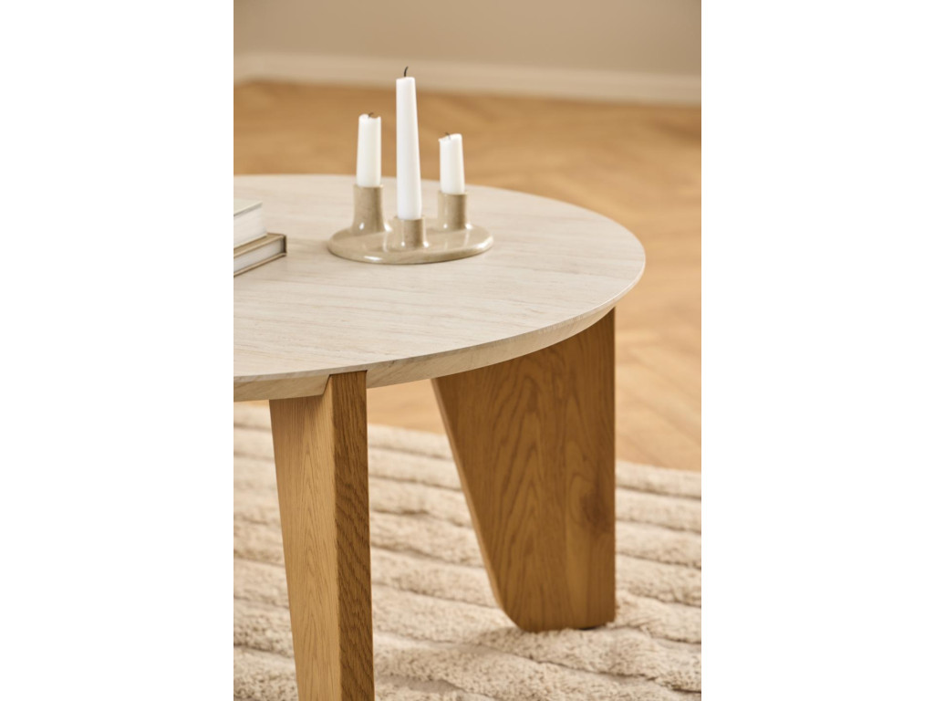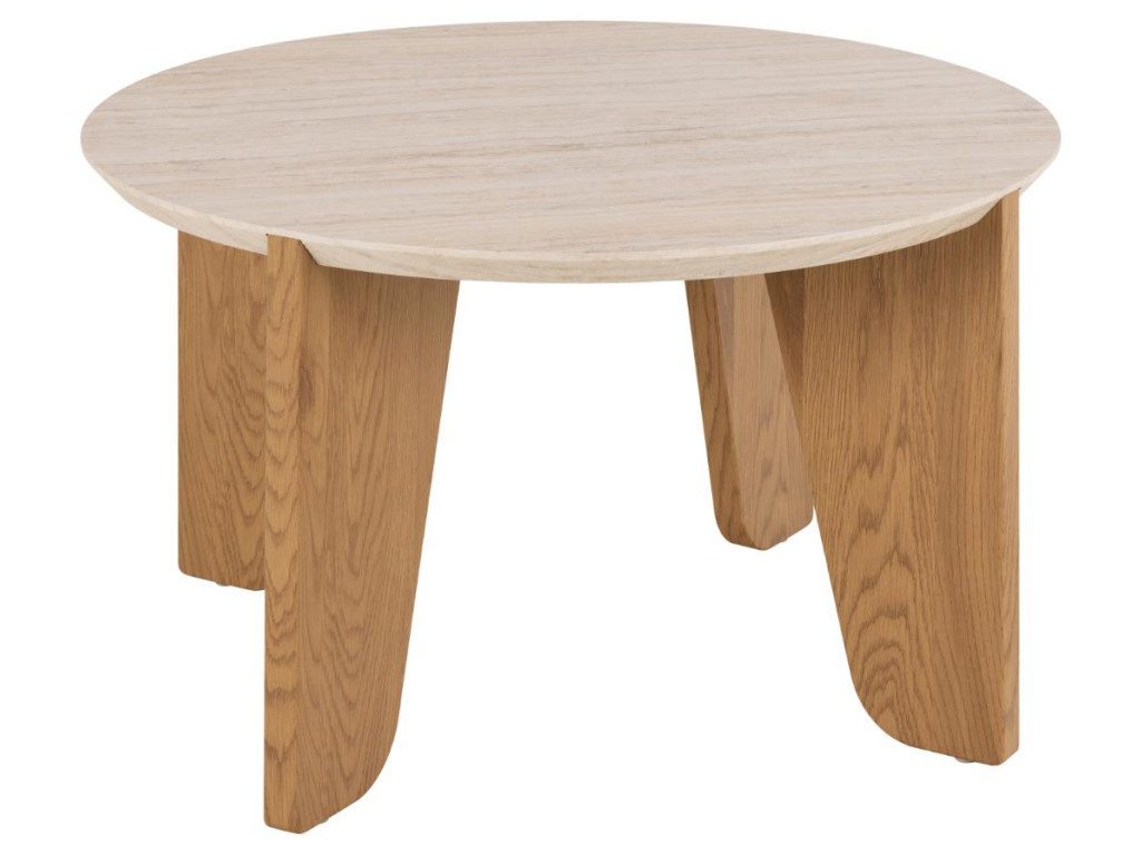 Okrúhly konferenčný stolík Dockland, Ø80x45 cm, spája vzhľad travertínu a divokého duba, čím vytvára harmonickú kombináciu prírodných tónov a moderného štýlu. Vďaka svojmu organickému dizajnu s jemne zaoblenými hranami a brúsenými nohami pôsobí ako výrazný vizuálny prvok v každej modernej obývačke. Okrúhla doska s realistickým travertínovým efektom sa opiera o stabilnú základňu vo vzhľade matného divokého duba, čo dodáva stolíku útulnosť a eleganciu zároveň.