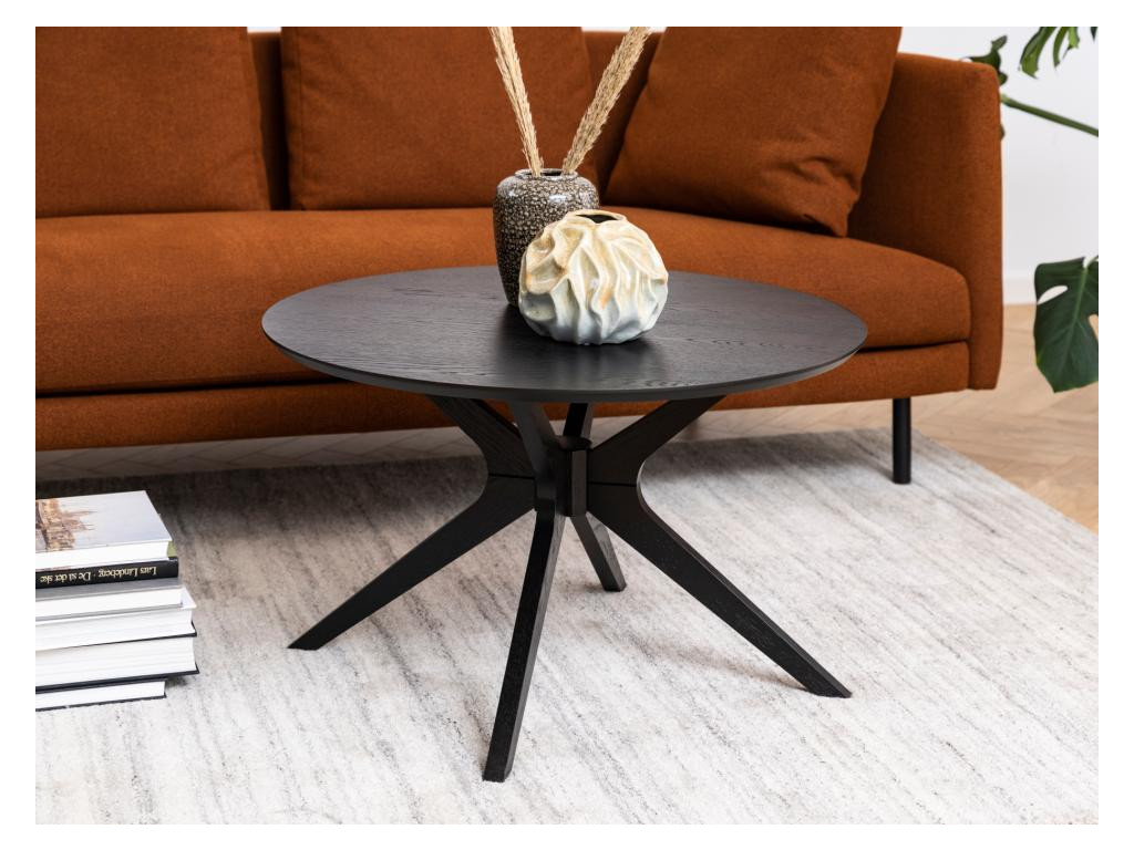 - Ø80 × 45 cm, vrchná doska a podnož z matnej čiernej dubovej dyhy (PU lak)