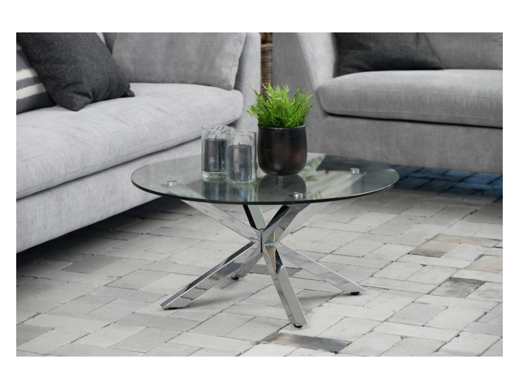 Konferenčný stolík Heaven okamžite upúta pozornosť svojím čistým, moderným vzhľadom a lesklou chrómovou základňou, ktorá mu dodáva nádych luxusu. Okrúhla doska z číreho tvrdeného skla vytvára vzdušný dojem a v kombinácii s krížovou 4-ramennou podnožou z chrómovej ocele pôsobí ako elegantný umelecký objekt vo vašej obývačke.