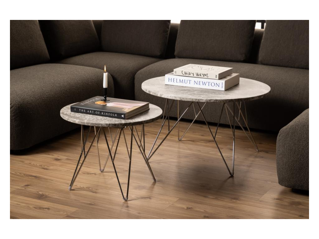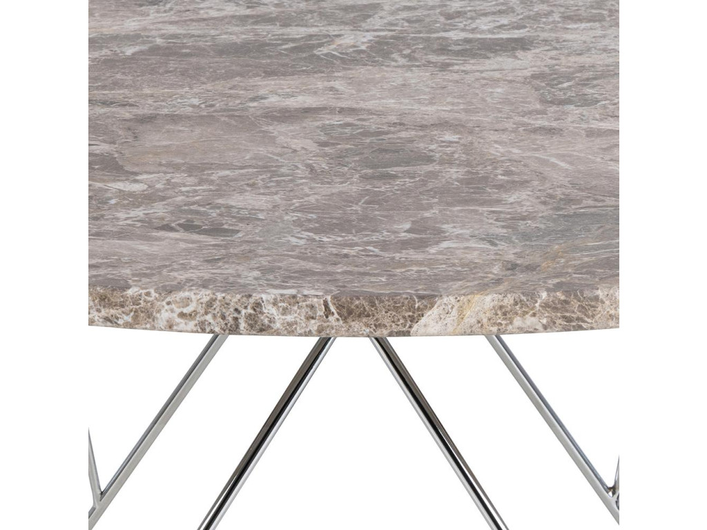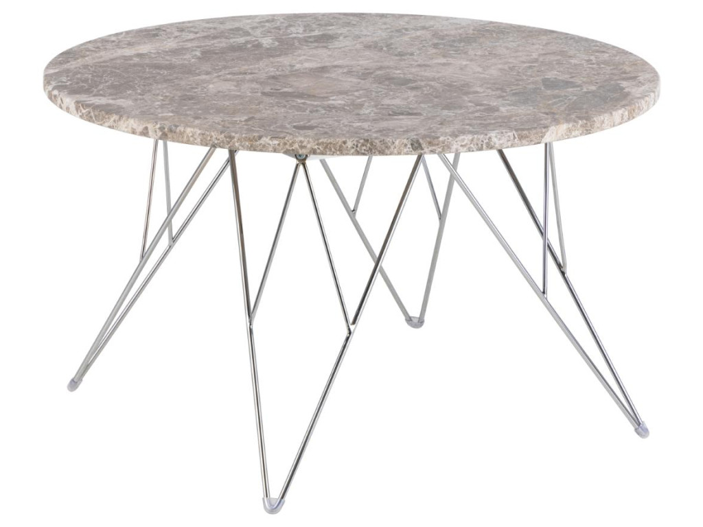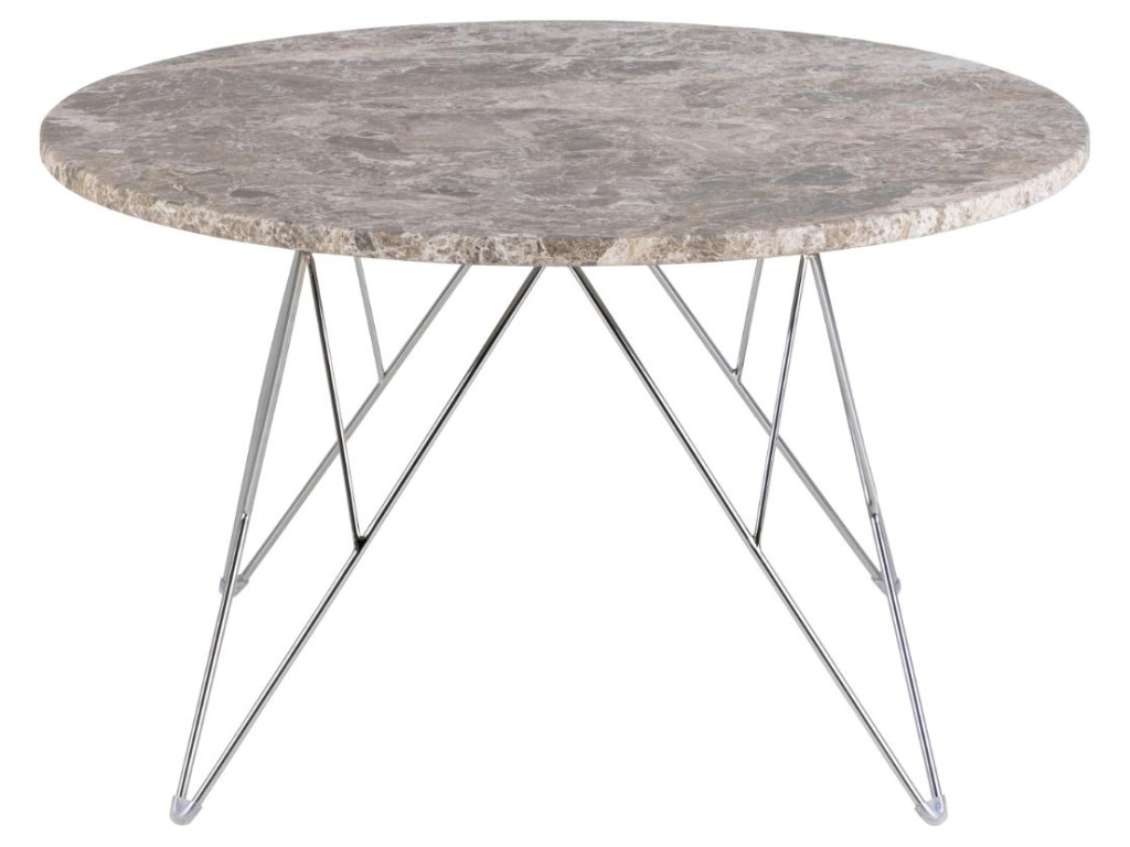 Tento stolík okamžite upúta pozornosť svojou elegantnou mramorovou doskou v odtieni sivohnedej, ktorá pôsobí ako umelecké dielo v priestore. Lesklá chrómovaná podnož z tenkej ocele mu dodáva ľahkosť a moderný šmrnc. Čisté línie a kvalitné materiály z neho robia univerzálny doplnok do každého interiéru – od minimalizmu po glamour.