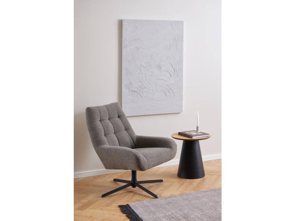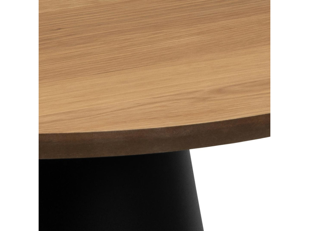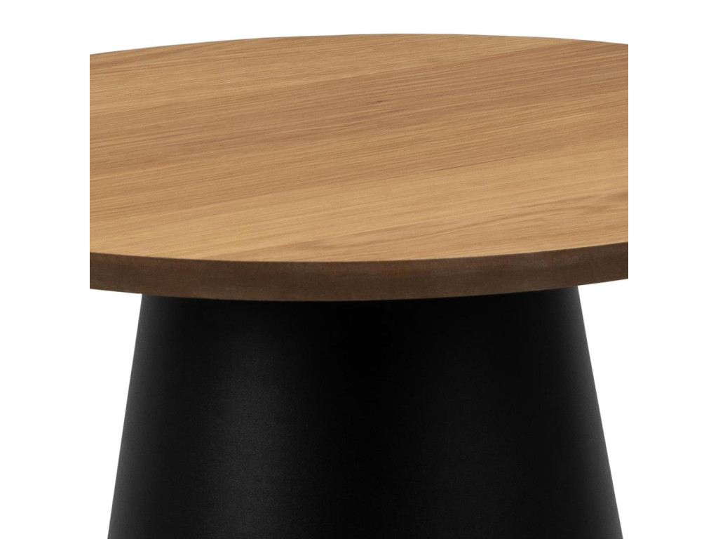 Konferenčný stolík Soli spája teplo dreva s industriálnym minimalizmom. Okrúhla vrchná doska z matnej dubovej dyhy s PU lakovaním vnáša do priestoru prírodný nádych a príjemnú textúru. Čierna oceľová podstava so stĺpovým tvarom a hrubou práškovou úpravou dodáva dizajnu modernú stabilitu.