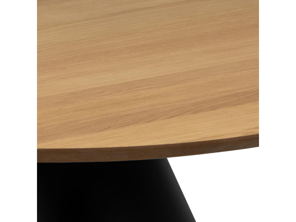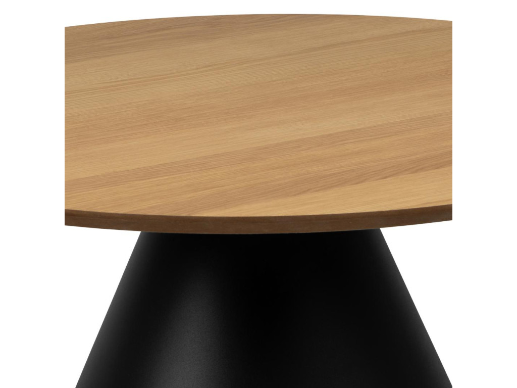 Tento okrúhly konferenčný stolík Soli spája prirodzené prvky s moderným industriálnym nádychom. Lakovaná dubová dyha pôsobí teplo a prívetivo, zatiaľ čo čierna kužeľová oceľová podstava s práškovým nástrekom dodáva celku dramatickosť a eleganciu.