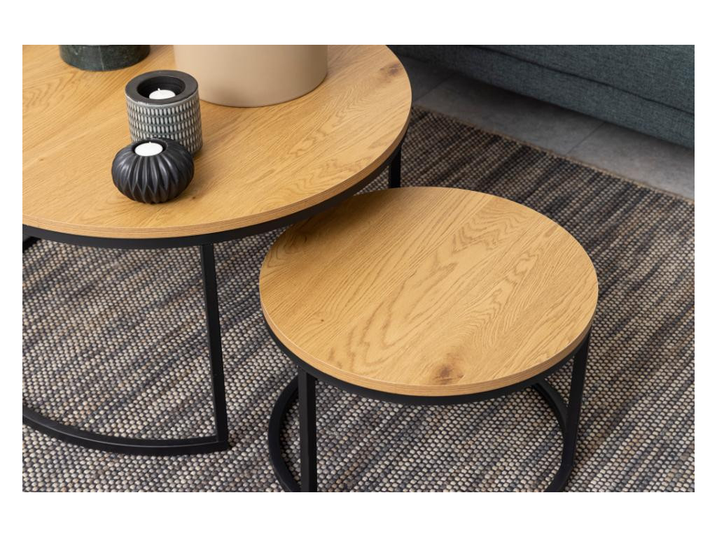 Okrúhla konferenčná súprava Spiro s prírodným vzhľadom divokého duba a čiernou kovovou podnožou pôsobí moderne a zároveň teplo. Kombinácia dvoch rôzne veľkých stolíkov umožňuje flexibilné usporiadanie podľa potreby – možno ich čiastočne zasunúť pod seba alebo umiestniť oddelene, čím vytvárajú ďalší odkladací priestor počas návštev. Matná melamínová doska napodobňujúca divoký dub dodáva stolom autentický charakter, zatiaľ čo čierny práškovo lakovaný kov zaručuje stabilitu a odolnosť.
