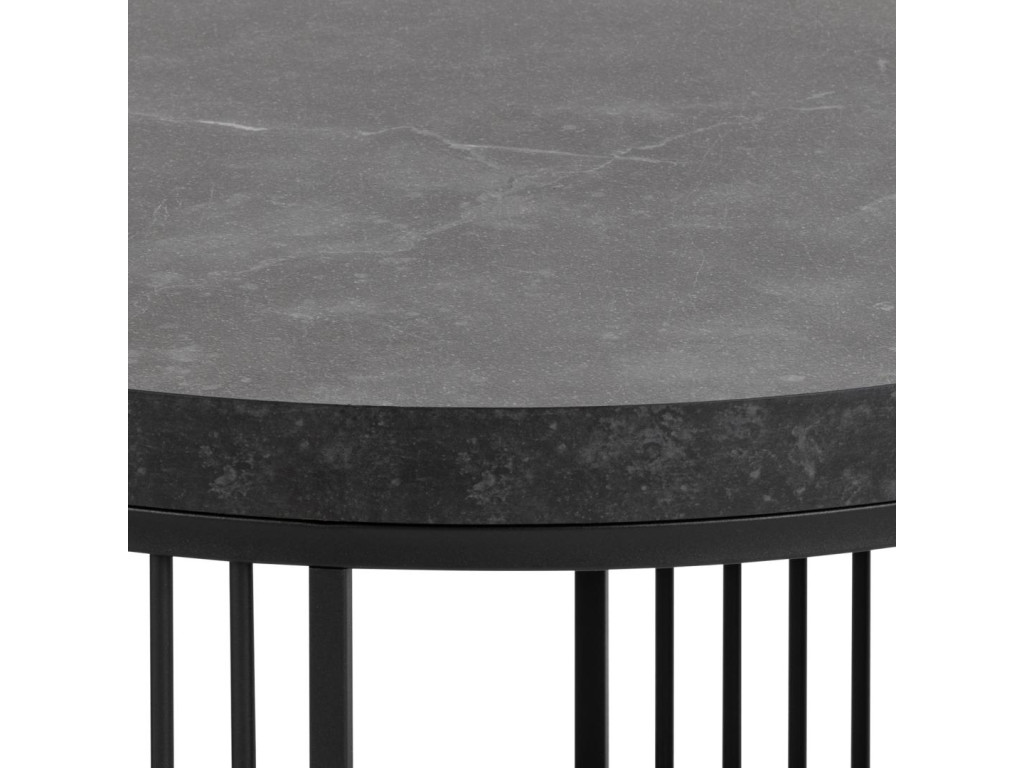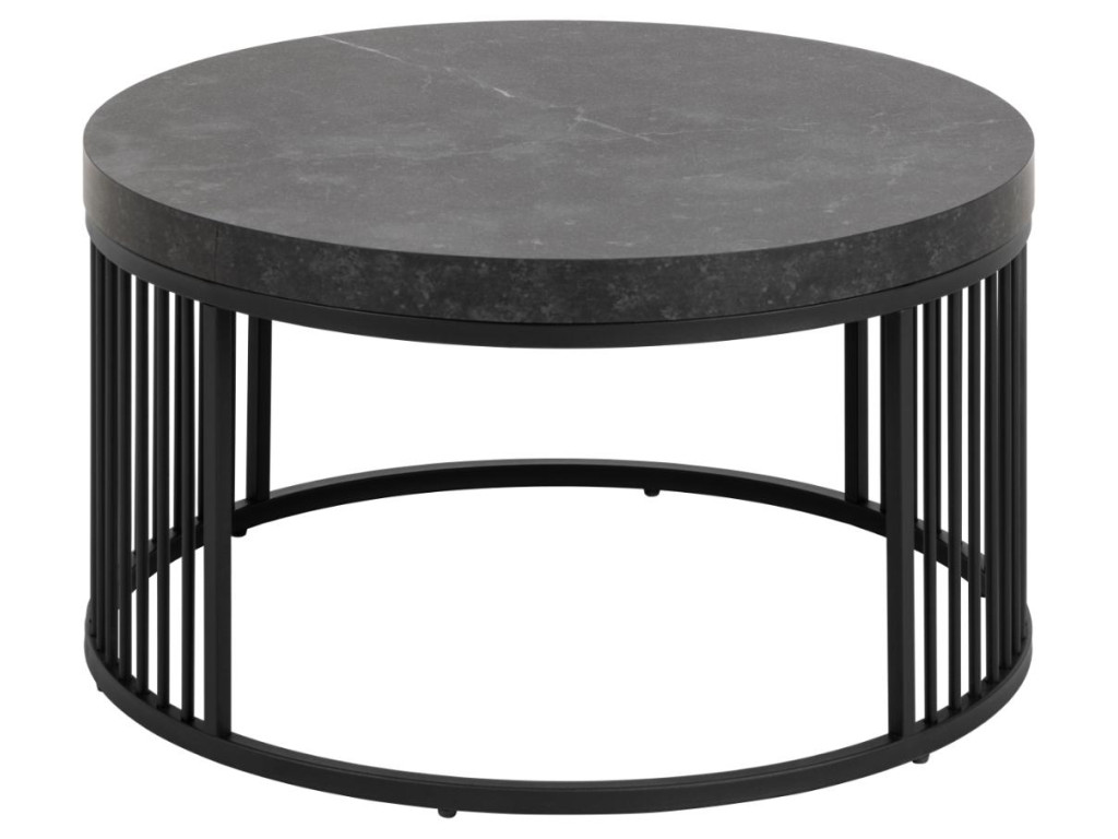Tento okrúhly konferenčný stolík z kolekcie Strington vyniká kombináciou čierneho mramorového vzhľadu a jemnej oceľovej geometrie. Vrchná doska v dekore matnej čiernej Izmir (melamín) pôsobí sofistikovane a je zasadená do čierneho oceľového rámu so zvislými drôtmi, ktoré mu dodávajú moderný architektonický výraz. Vďaka svojmu kompaktnému priemeru 65 cm a výške 35 cm je ideálny do obývacej izby ako hlavný alebo doplnkový konferenčný stolík. Minimalistický tvar a kontrast materiálov z neho robia pútavý a zároveň nadčasový prvok každého priestoru.
