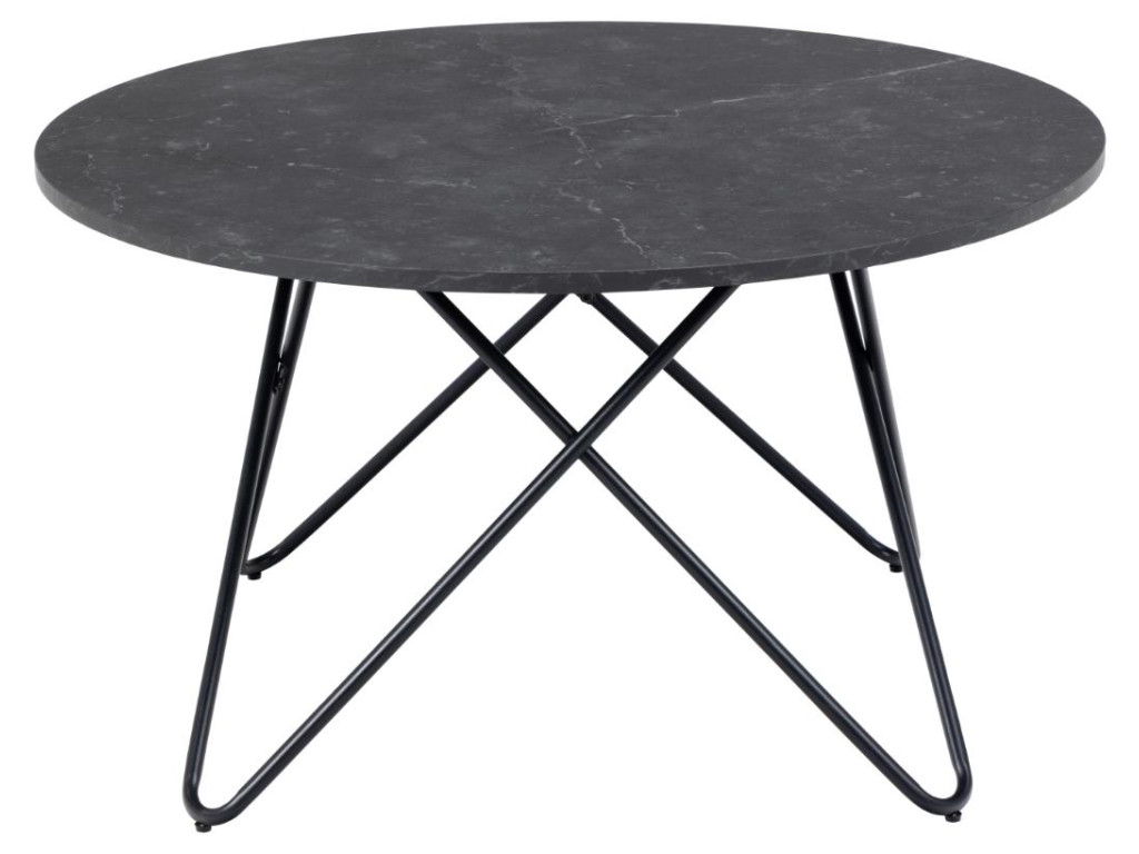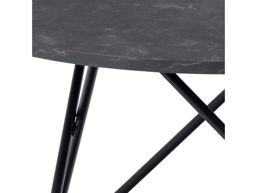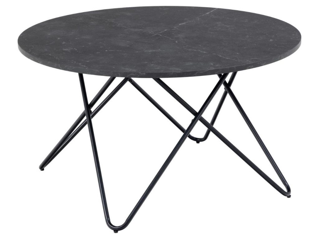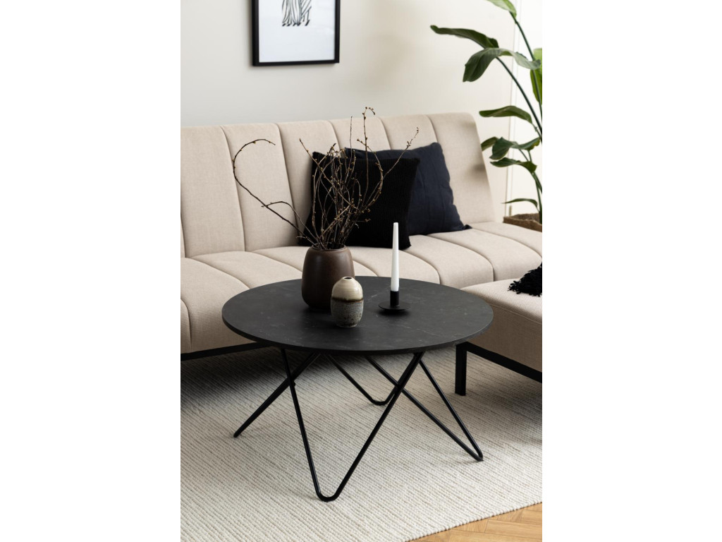 Vrchná doska s matným povrchom a vzhľadom čierneho mramoru Izmir pôsobí rafinovane a súčasne sa ľahko udržiava. Je vyrobená zo surového melamínu, čo zaručuje odolnosť voči poškriabaniu aj jednoduchú údržbu. Jej decentný vzhľad kontrastuje s drôtenou geometrickou podnožou z ocele s matným čiernym práškovým nástrekom, ktorá dodáva stolíku vzdušnosť a originálny výraz.