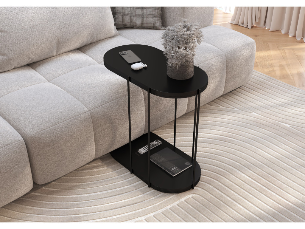Príručný stolík Luxo s dvojúrovňovým dizajnom je ideálnym doplnkom pre každý moderný interiér. Vďaka kompaktným rozmerom a ľahkej konštrukcii sa jednoducho prenáša a skvelo zapadne do obývačky aj spálne. Horný čierny polomatný MDF povrch poskytuje pohodlné miesto na nápoje alebo občerstvenie, zatiaľ čo spodná doska vytvára priestor na ukladanie každodenných drobností, ktoré chcete mať vždy po ruke.