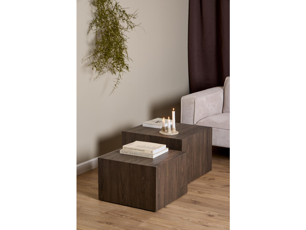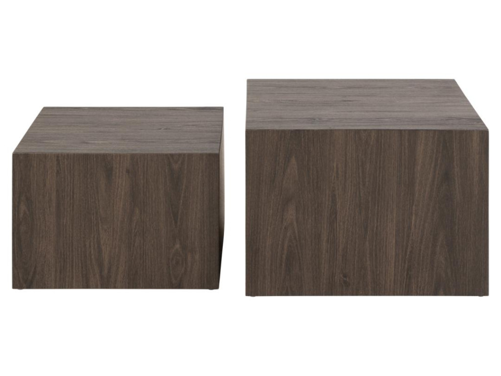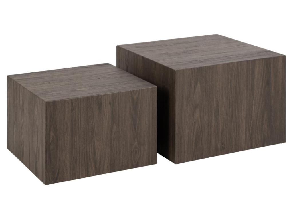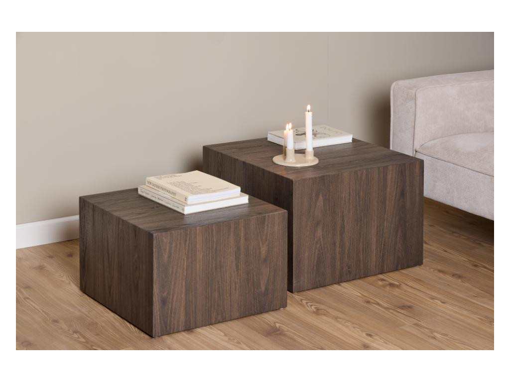 Set Dice v dekore údeného duba pôsobí prírodne a elegantne. Dva rôzne rozmery umožňujú variabilné usporiadanie. Štvorcový tvar je ideálny na dekorácie, lampy či knihy. Vhodné do rustikálneho aj moderného interiéru.