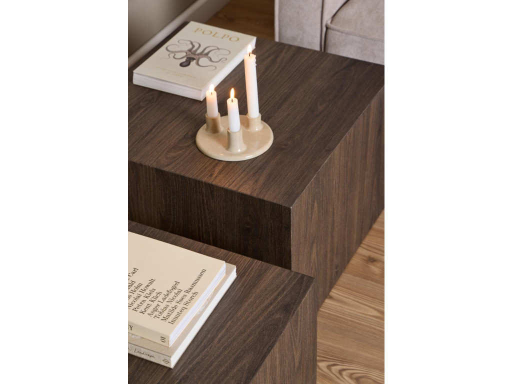 Súprava stolíkov v dekore zadymeného duba ponúka vizuálne teplo a štruktúru. Tento prirodzený vzhľad je ideálny do útulných, ale štýlových priestorov. Hodí sa do interiérov v rustikálnom alebo severskom štýle.