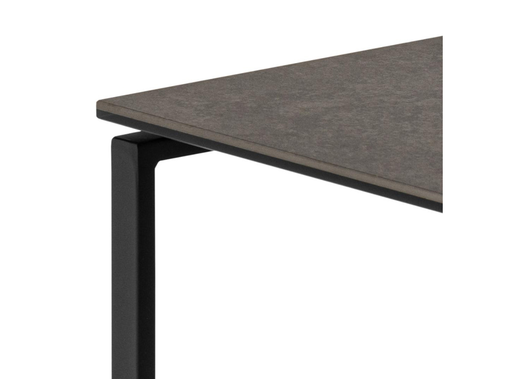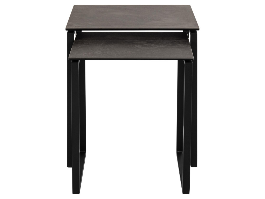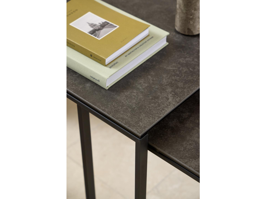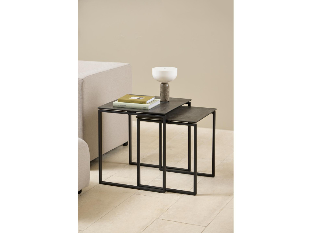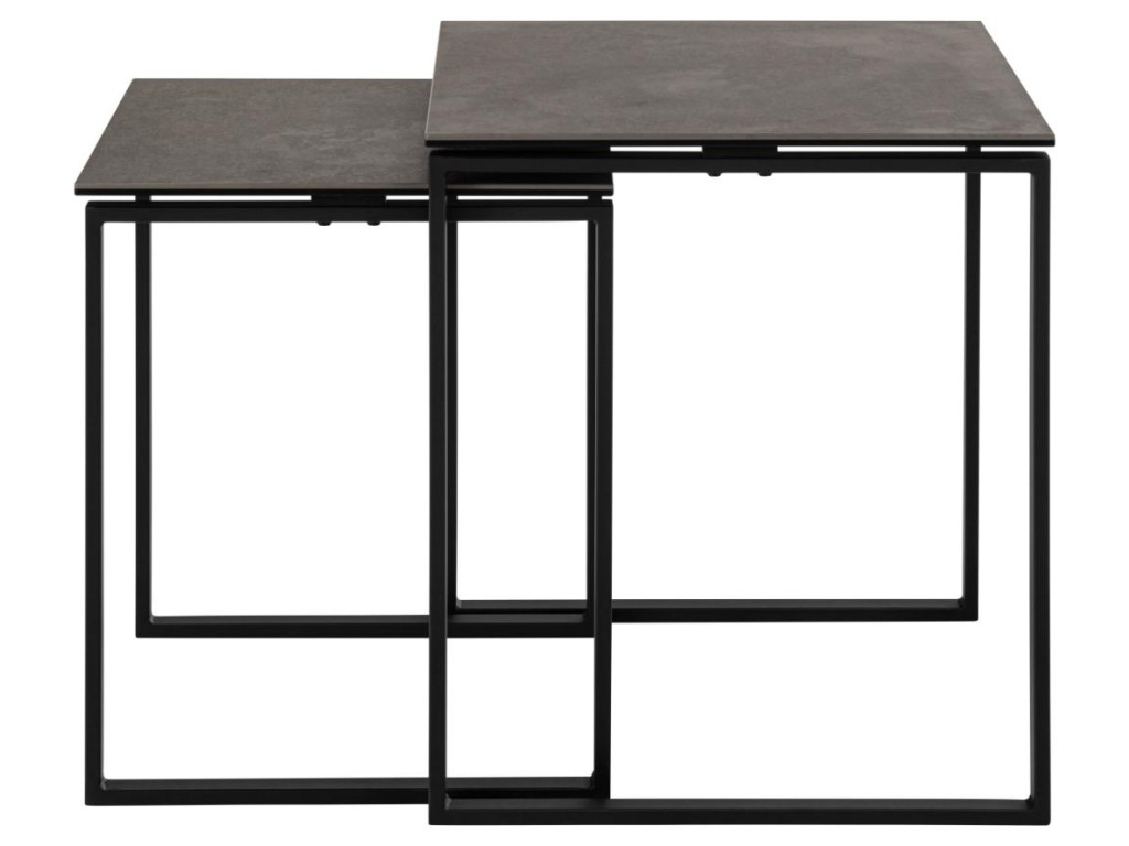 Minimalistická elegancia a kontrastná kombinácia materiálov – to je súprava konferenčných stolíkov Katrine. Dva štvorecné stolíky rôznych výšok s keramickou doskou v čiernom odtieni Fairbanks a pevným kovovým rámom vytvárajú funkčný i štýlový doplnok. Matná čierna oceľ so saním podstavcom dodáva stabilitu a industriálny vzhľad. Možno ich použiť spolu aj samostatne.