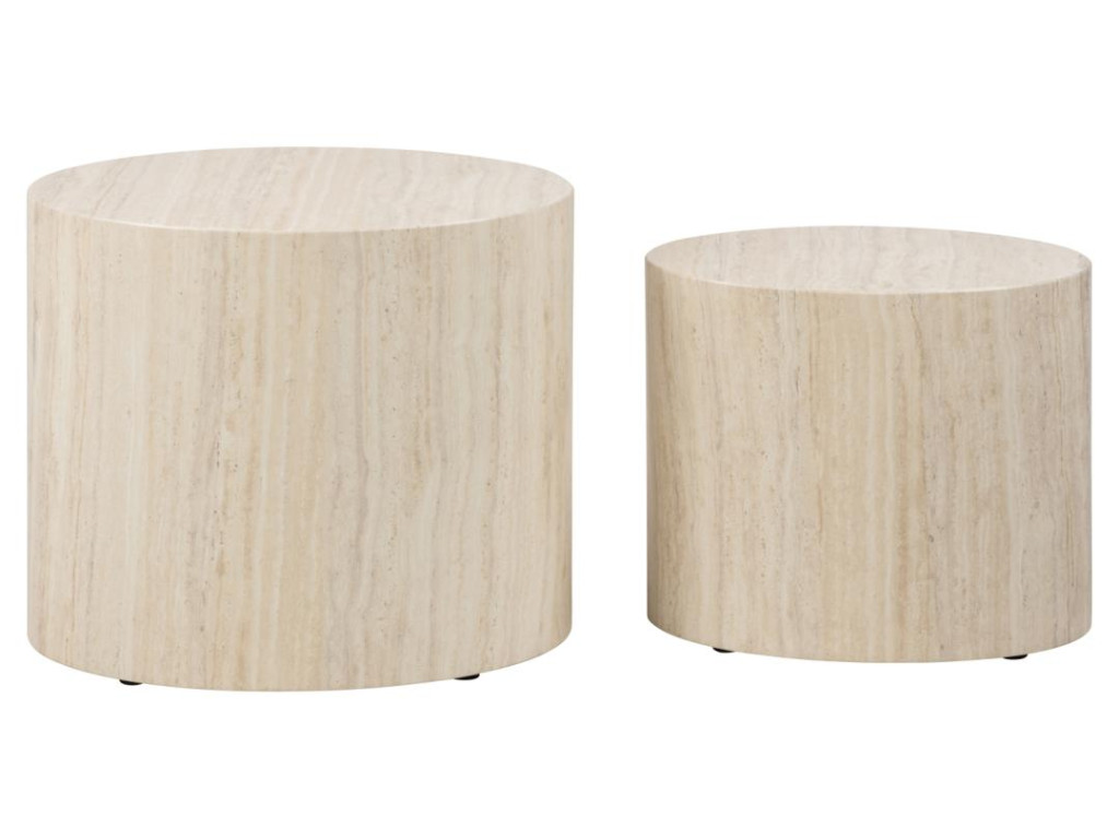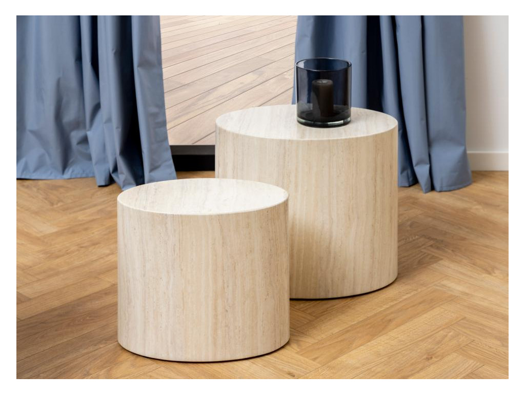 Oválna súprava konferenčných stolíkov Mice je dostupná aj v elegantnom vyhotovení béžový travertín. Tento prírodne pôsobiaci dizajn dodáva interiéru jemný, sofistikovaný vzhľad a výborne zapadne do svetlých, neutrálne ladených priestorov. Oválny tvar a možnosť zasunutia menšieho stolíka pod väčší robia zo súpravy praktický a zároveň estetický doplnok.
