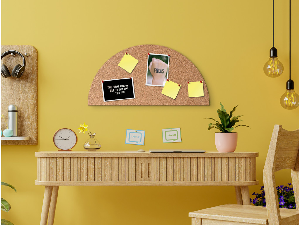 Polkruhová korková tabuľa je nielen praktická, ale aj esteticky príjemná, čím premení každú stenu na miesto plné kreativity a organizácie.