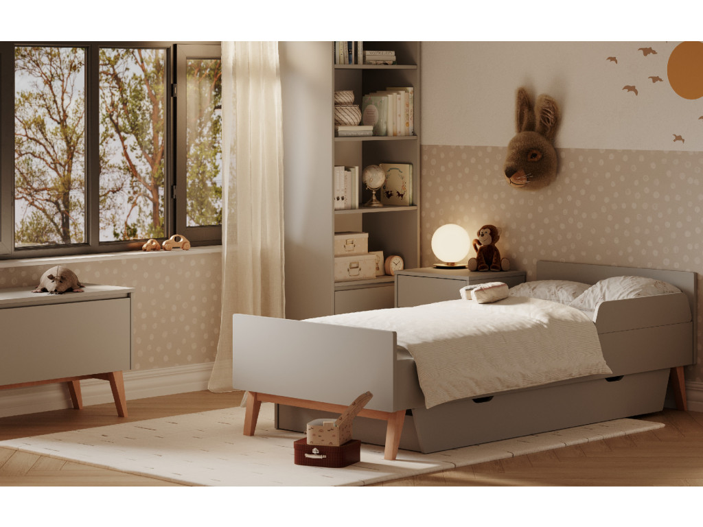 Sivá bednička na hračky Swing na bukových nožičkách zapadne do dievčenskej aj chlapčenskej izbičky. Truhlica je priestranná, ideálna na uloženie hračiek, ale aj posteľnej bielizne či oblečenia.