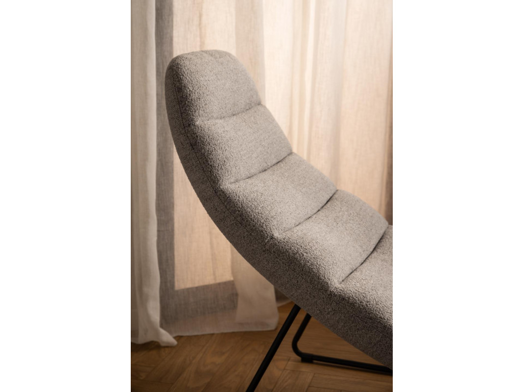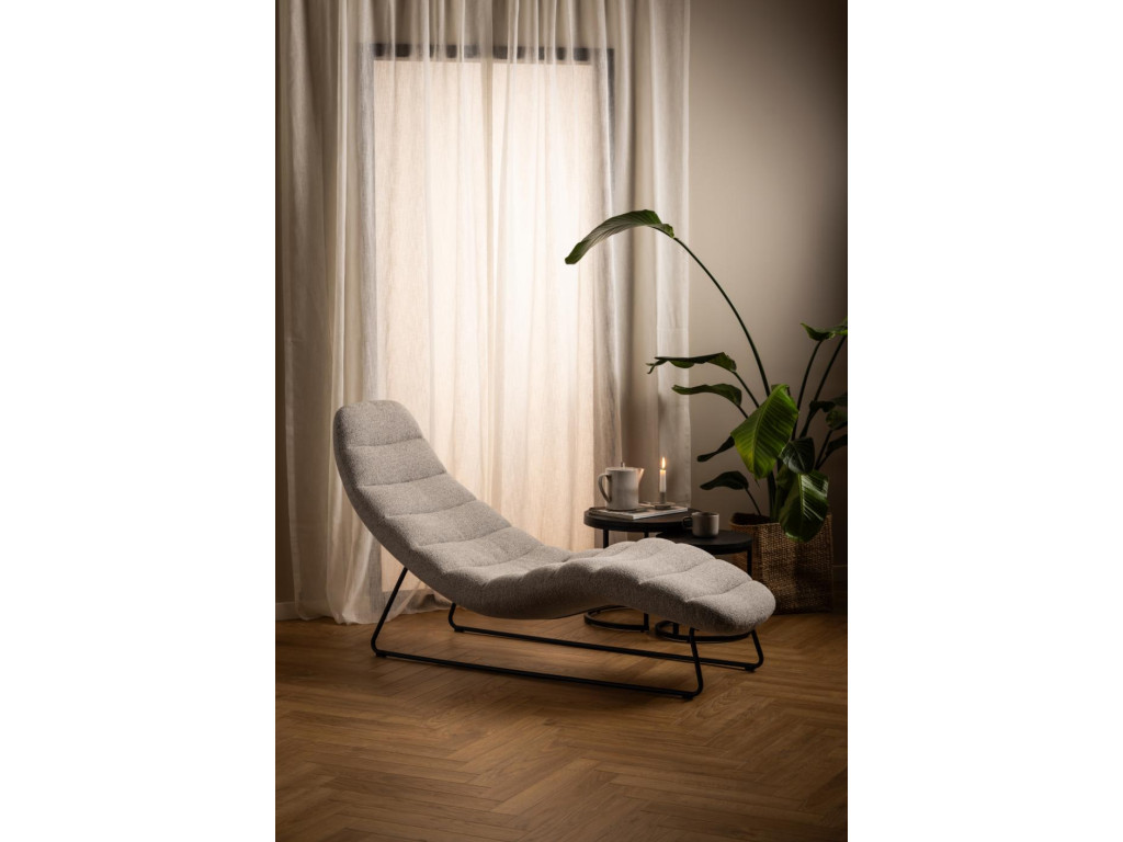 Pohodlné a elegantné ležadlo s béžovým buklé poťahom a modernou čiernou oceľovou podnožou. Kľukatý tvar a horizontálne prešívanie vytvárajú útulné miesto na oddych v každom interiéri.