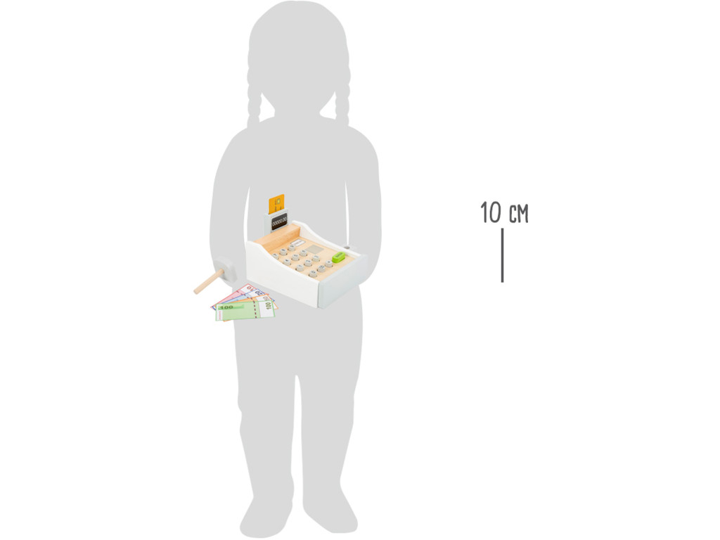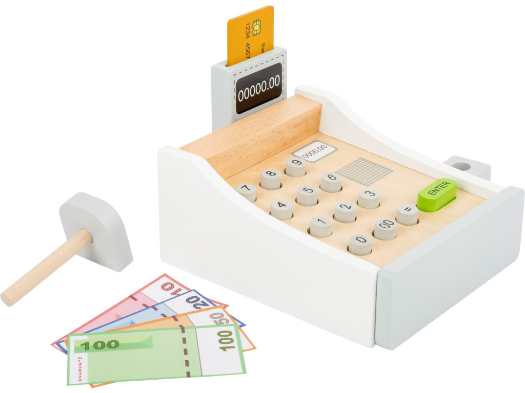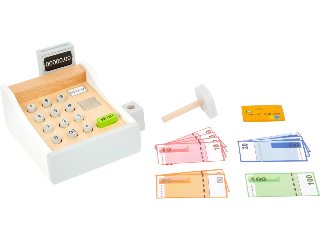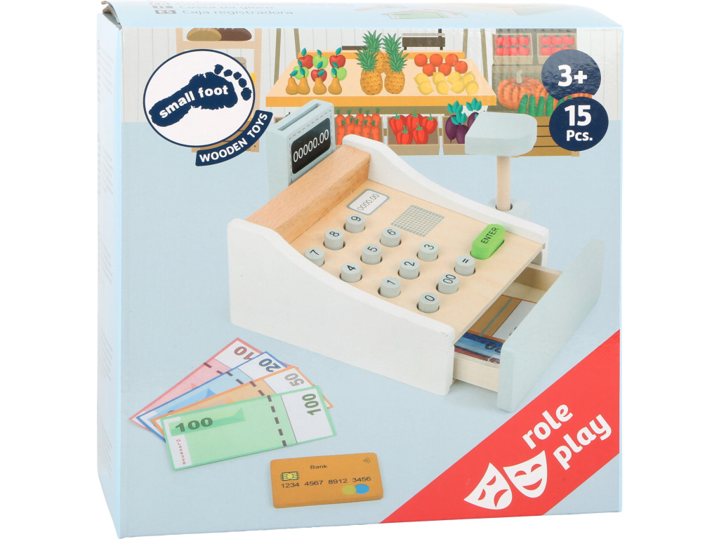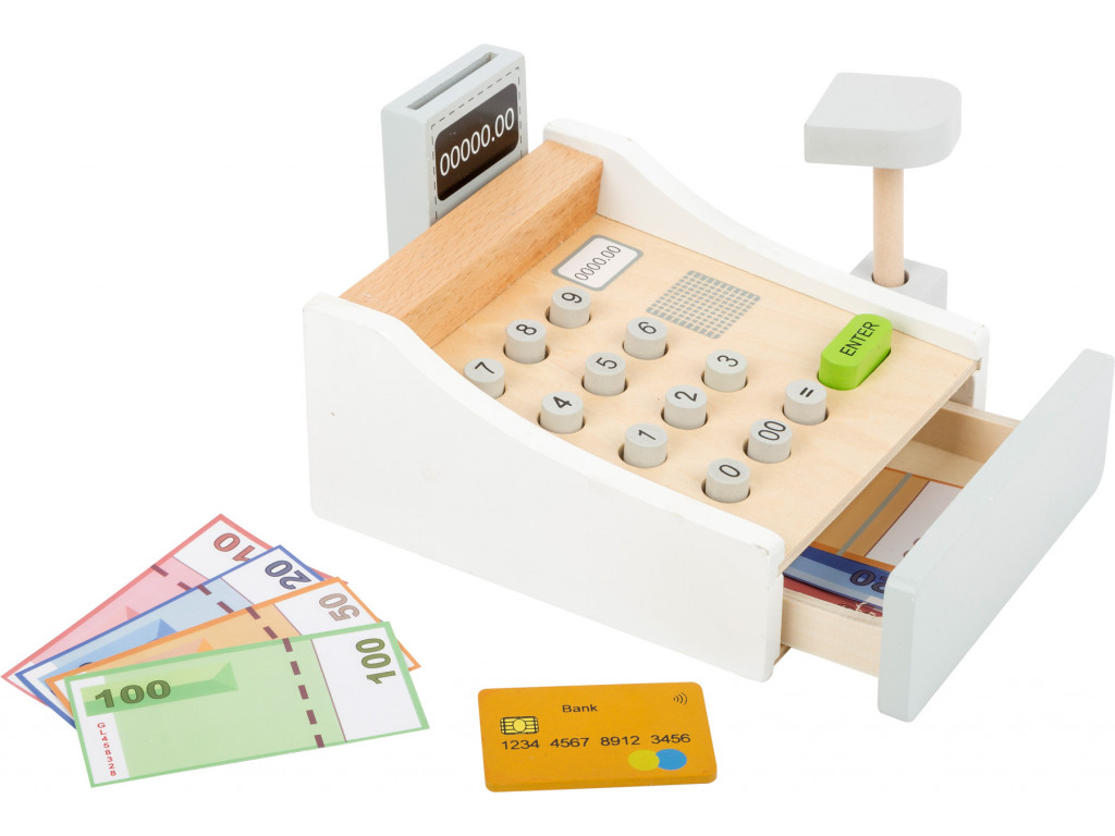 Žiaden obchod, dokonca aj detský sa nezaobíde bez drevenej pokladne, ktorá obsahuje množstvo príslušenstva. Okrem pokladne sem nájdete bankomatovú kartu, čítačku kariet, skener a množstvo bankoviek. Pokladnica má zásuvku, do ktorej si môžete ukladať všetky peniaze.