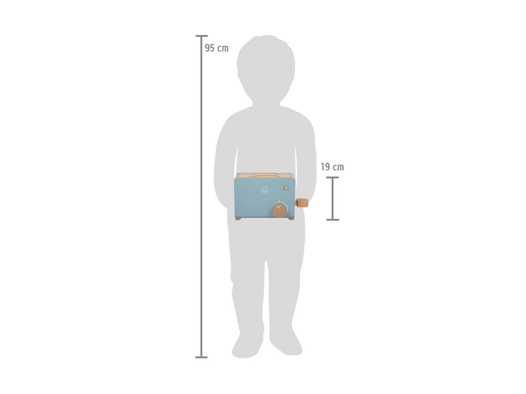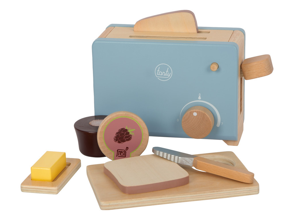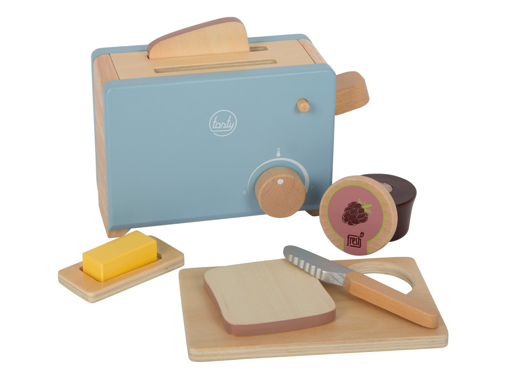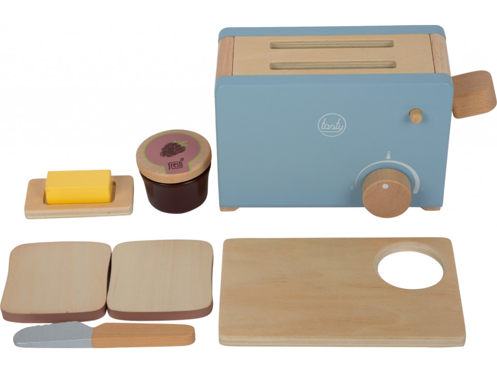 S týmto hriankovačom a jeho príslušenstvom budú každé raňajky pripravené v detskej kuchynke hitom! Má interaktívnu vyskakovaciu funkciu a jemný dizajn v dymovo modrej a bielej, hračka má aj mnoho prírodného dreva. Medzi bohatým príslušenstvom nájdete plátky toastového chleba, nôž, maslo, marmeládu, čo pomôže pri realistickej hre! Hriankovač má otočné a pohyblivé tlačidlá, páčku.