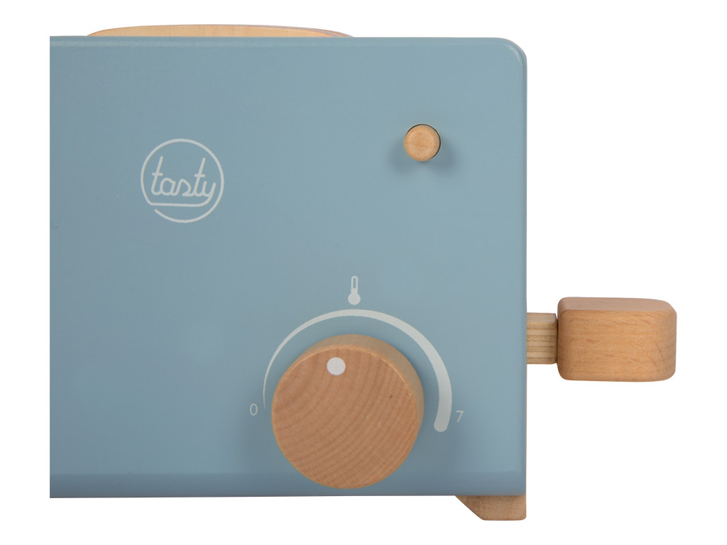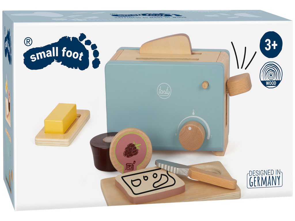 Plátky toastu do hriankovača zasuniete pomocou veľkej páčky na boku, rovnako tak ich aj vysuniete. Otočným kľukajúcim tlačidlom môžu deti nastaviť teplotu. Raňajkový lopár môžete vďaka otvoru zavesiť, zaberie tak pri skladovaní menej miesta. Táto sada má farebný dizajn kompatibilný s ďalšími produktmi radu Tasty od Small Foot, napríklad drevenou kuchynkou Tasty a kuchynským náčiním Tasty.