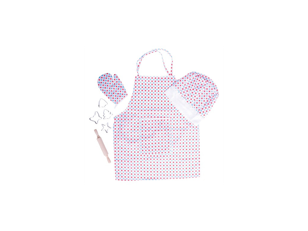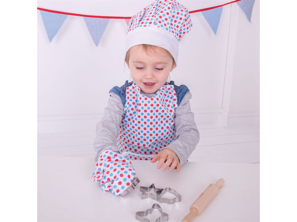 Mladé talenty v kuchyni budú milovať túto bodkovanú bavlnenú súpravu na pečenie alebo varenie, ktorá obsahuje zásteru, chňapku, kuchársku čiapku, valček a vykrajovače. Ideálne na použitie v asistovanom varení alebo pečení s dospelými, alebo pri hraní v detskej kuchynke. Dokonalé príslušenstvo na hranie rolí, ktoré si vaše dieťa určite rado stvárni.