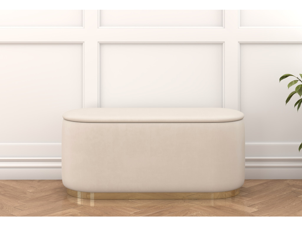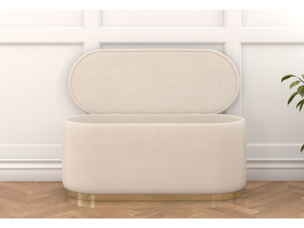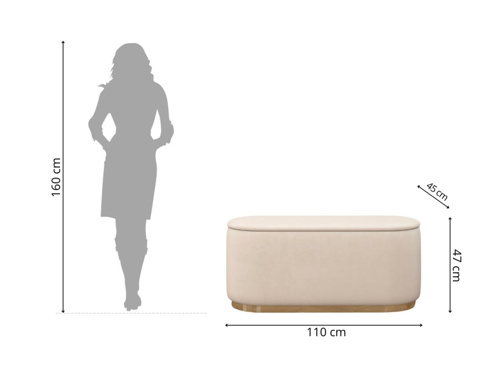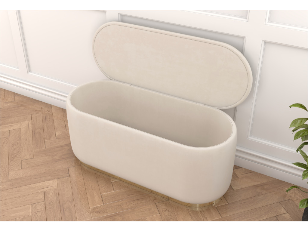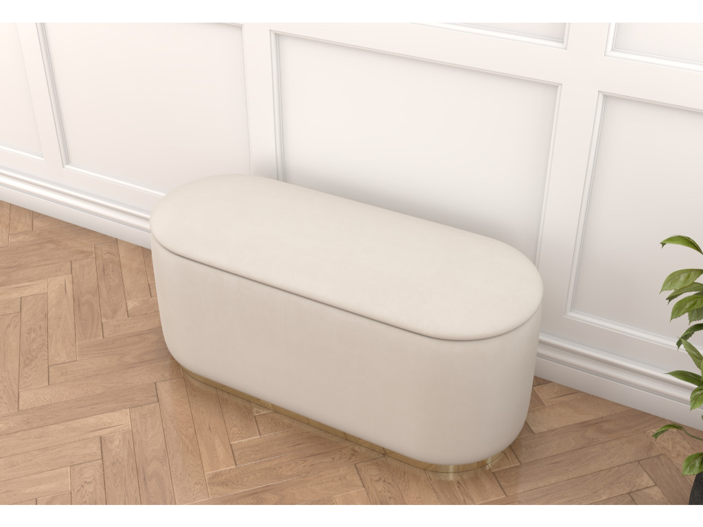 Oválna taburetka Seleste prináša moderný dizajn s elegantným zlatým pásom na základni a priestranným úložným priestorom. Vďaka oderuvzdornému čalúneniu, ktoré sa ľahko čistí, ponúka štýlovú a praktickú voľbu pre každý interiér.