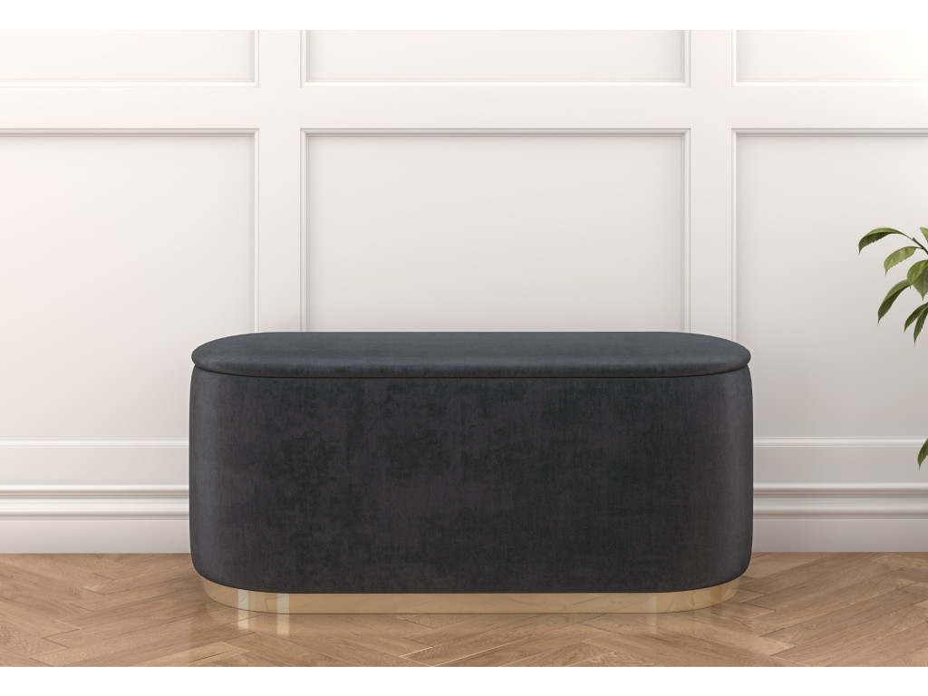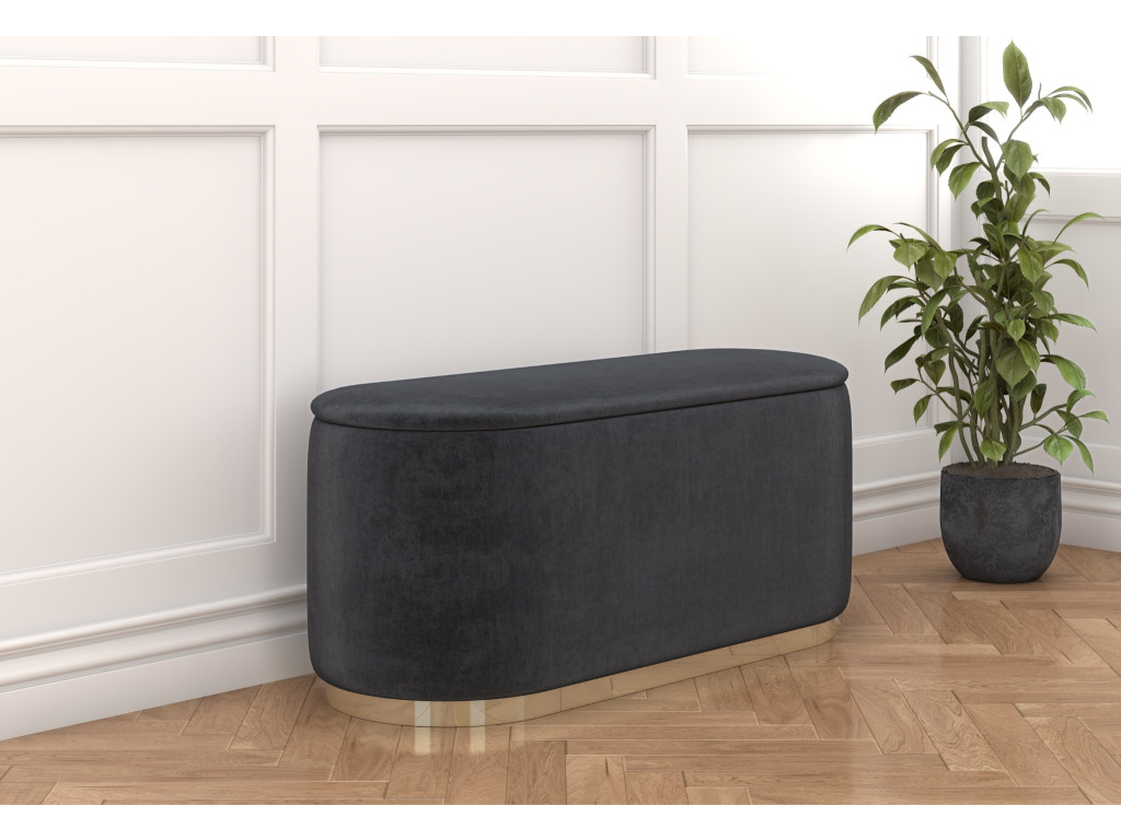 Oválna taburetka Seleste prináša moderný dizajn s elegantným zlatým pásom na základni a priestranným úložným priestorom. Vďaka oderuvzdornému čalúneniu, ktoré sa ľahko čistí, ponúka štýlovú a praktickú voľbu pre každý interiér.