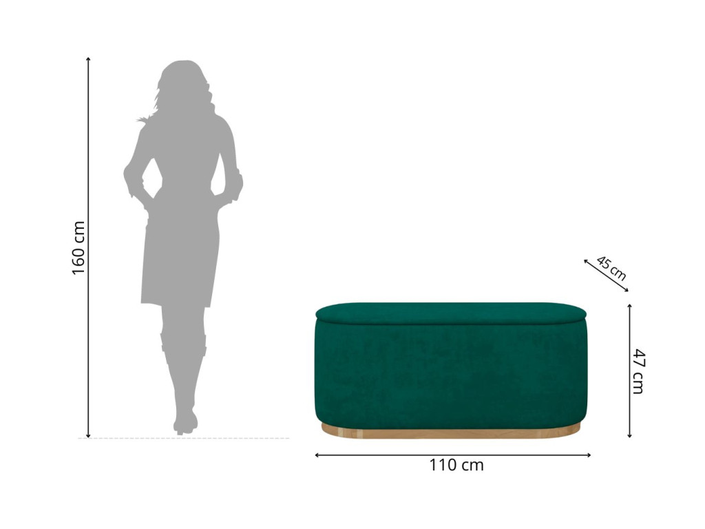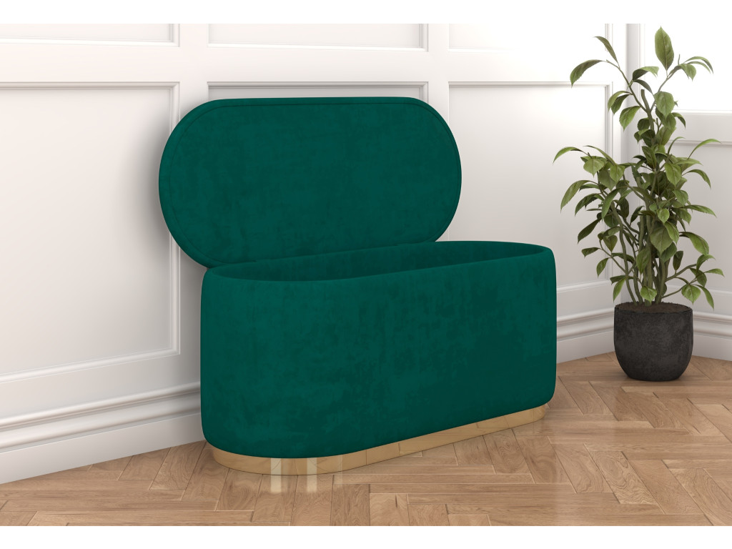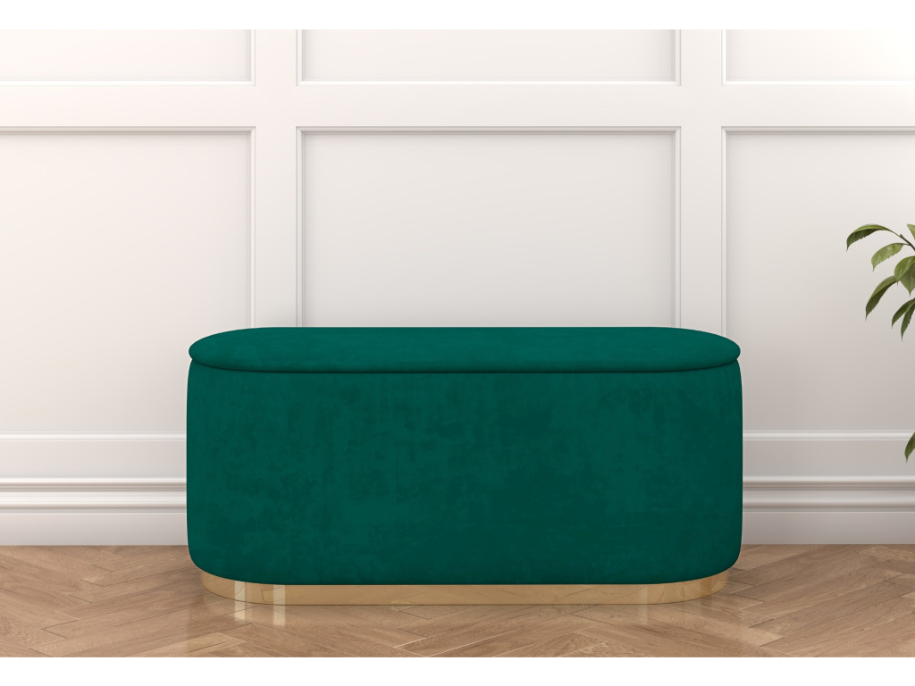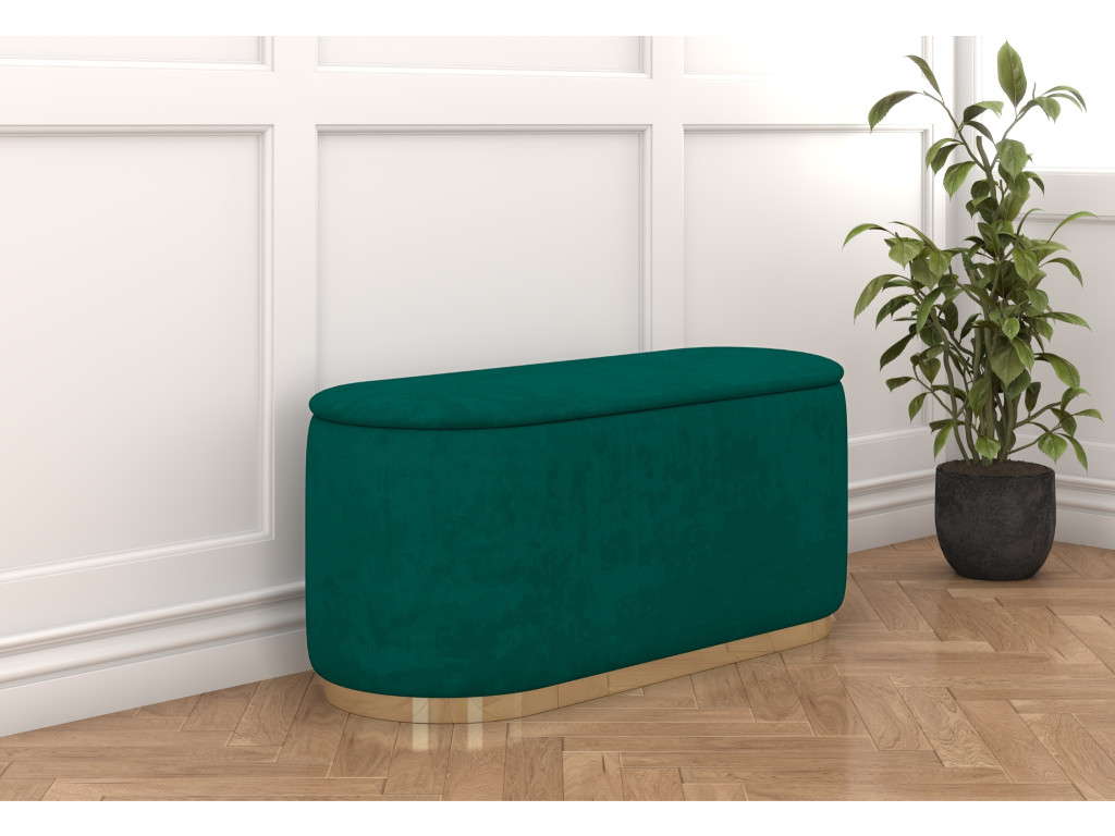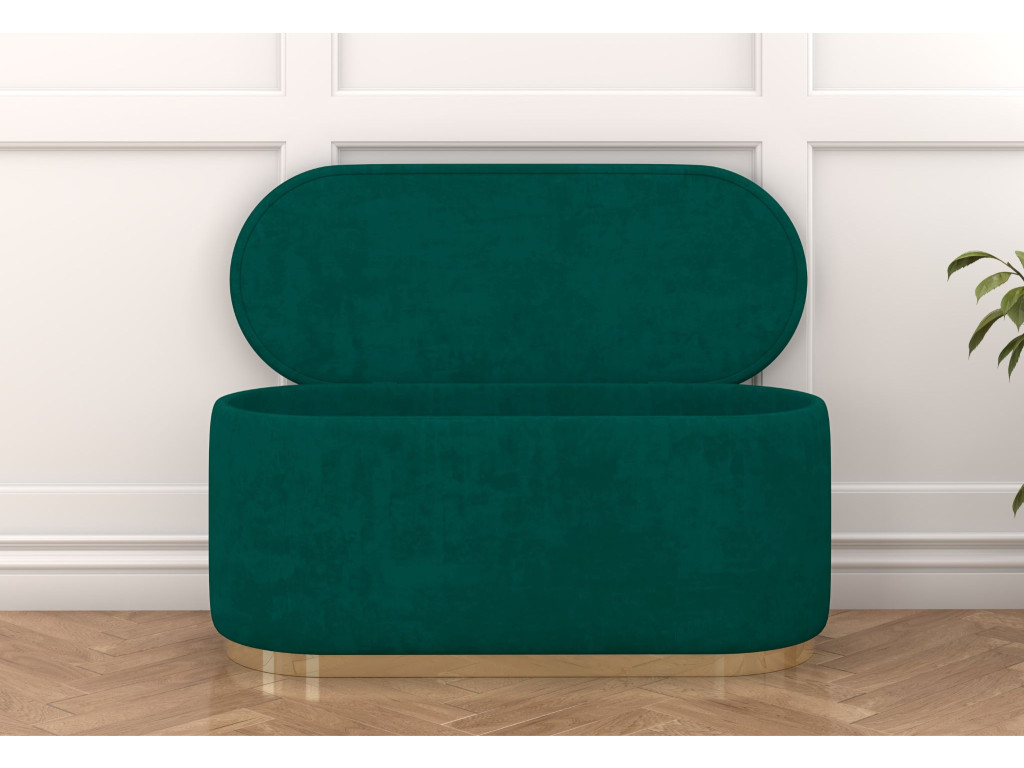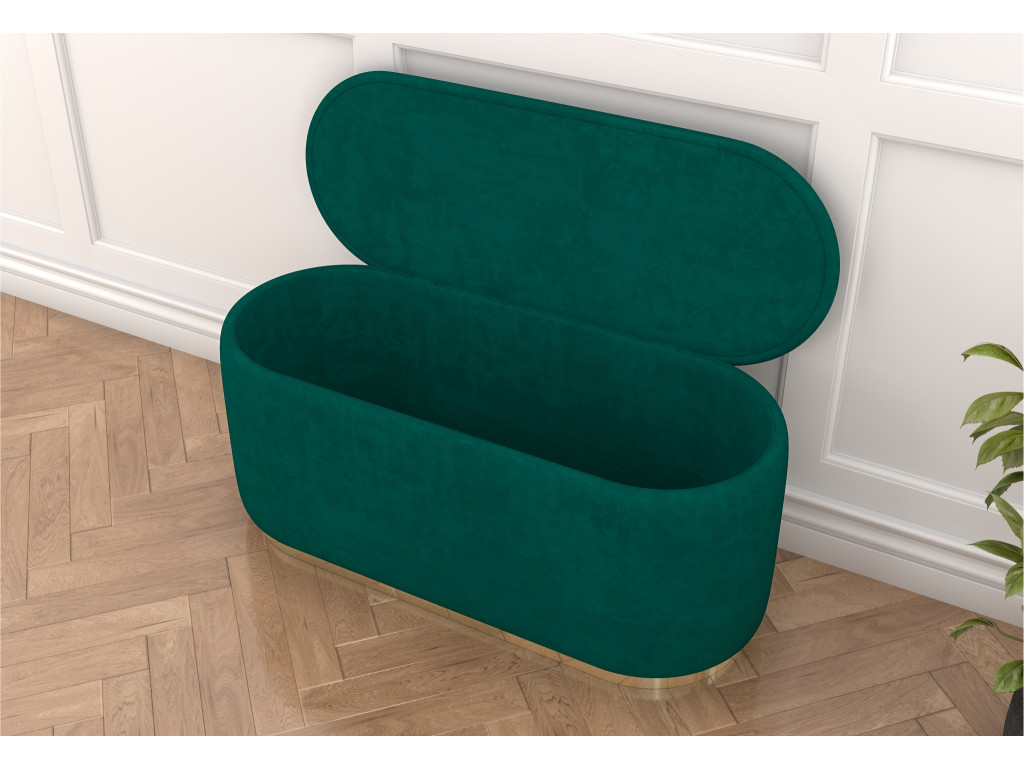 Oválna taburetka Seleste v elegantnej zelenej farbe, so zlatým pásikom ponúka štýlový vzhľad a praktický úložný priestor. Odolné čalúnenie sa ľahko čistí, čo z nej robí ideálny doplnok do moderného interiéru.