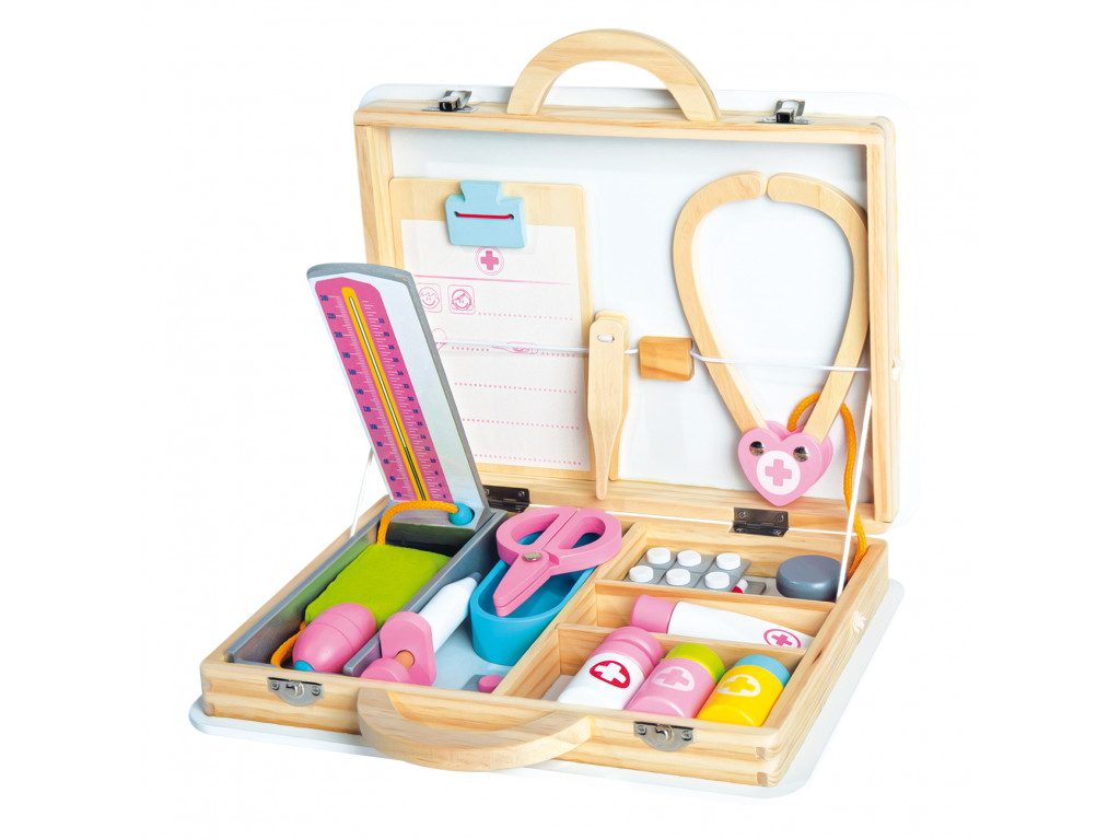 Drevený lekársky kufrík pre malého lekára. Ideálne na hranie rolí, či už lekára alebo zdravotnú sestričku. Môžu tak preskúmavať svet dospelých a užiť si pri tom veľa zábavy. Deti kufrík ľahko otvoria, vyberú z neho potrebné lekárske náčinie a po skončení hrania ho zase znovu uložia. Rozsiahle príslušenstvo tvorí až 16 doplnkov. Všetky sú dobre zaistené širokými gumovými pútkami. Hravou formou tak trénujú jazykové zručnosti, jemnú motoriku a podporujú predstavivosť. Detská zábava tak napomáha zmenšiť strach a obavy z návštevy lekára. Vhodné pre deti od 36 mesiacov.